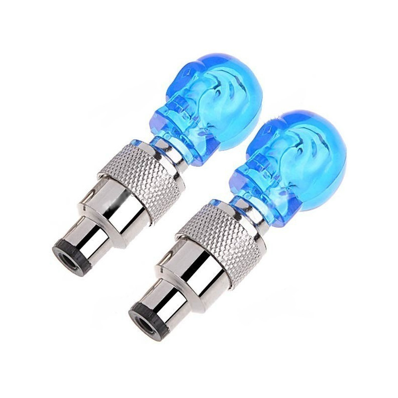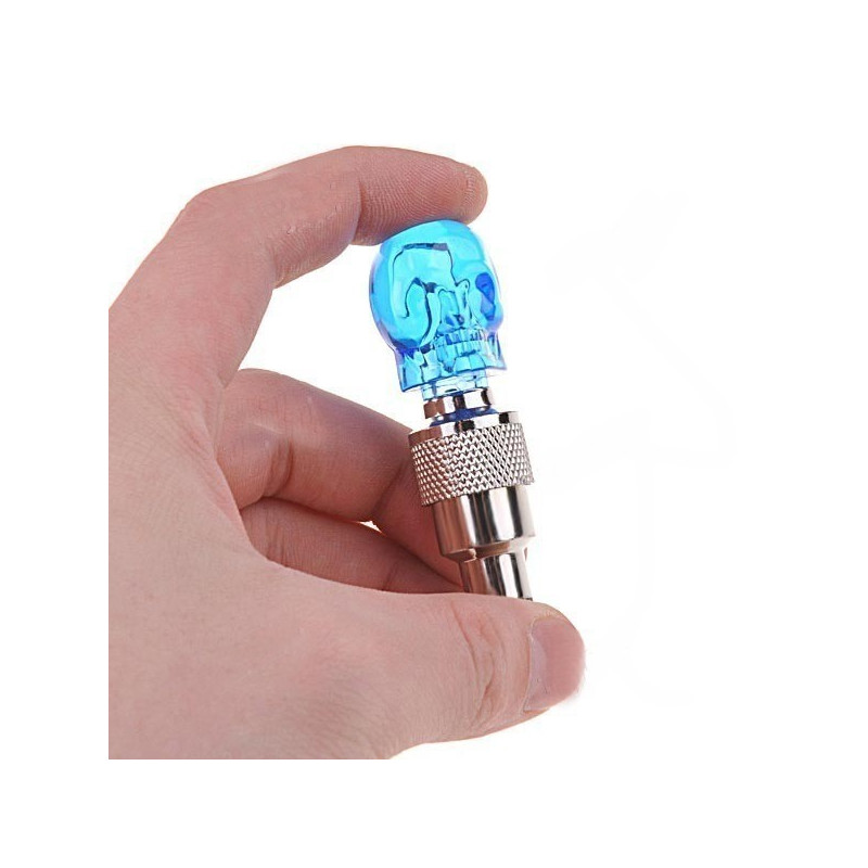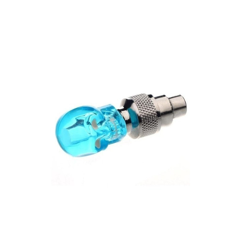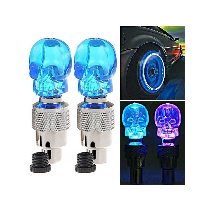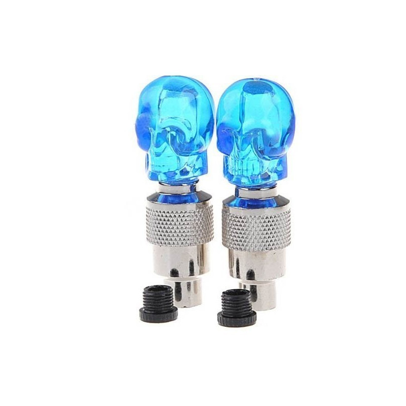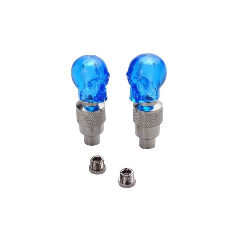 Светещите LED капачки за вентили с череп мотив, син цвят, са идеалния аксесоар, който ще ви отличи на пътя през нощта или в тъмнината на някой паркинг. Тези капачки са направени от неръждаема стомана и са лесни за инсталиране - просто ги навийте към вентилите на вашите гуми.