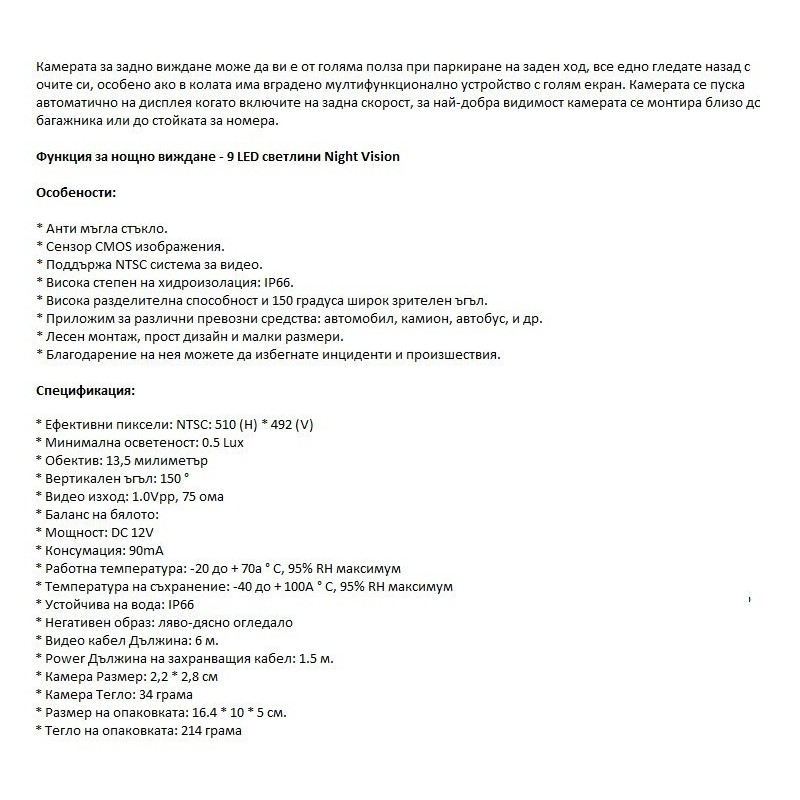 Търсите надеждна и удобна камера за задно виждане за вашия автомобил? Не търсете повече! Представяме ви водоустойчивата камера за задно виждане DVR-328 с нощен режим и 9 LED диода.