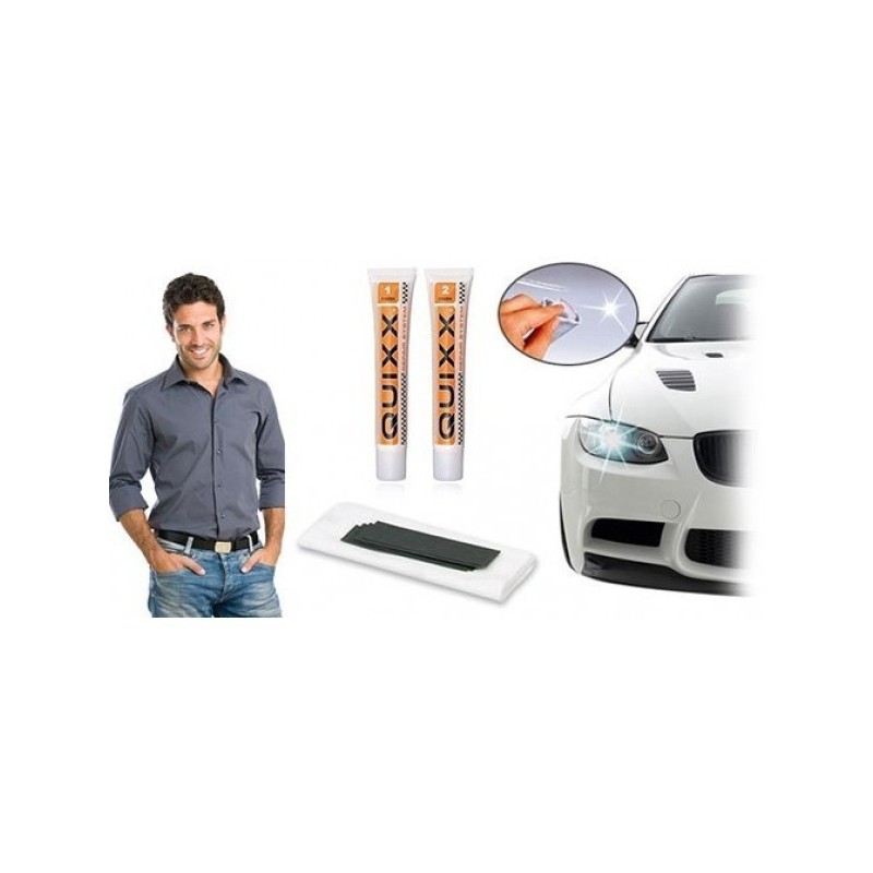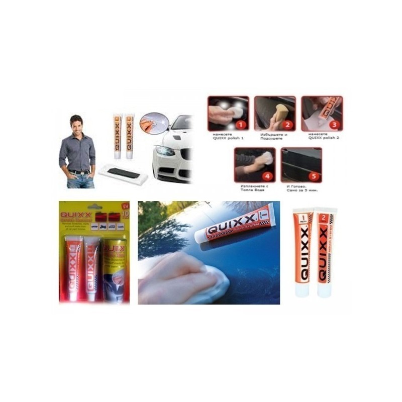 Използването на комплекта QUIXX Scratch Remover е много лесно. Първо, нанесете гела Quixx polish 1 върху надрасканата повърхност и с кръгови движения търкайте около 2-3 минути с чиста памучна кърпа. След това използвайте гела Quixx finish 2 за полиране до блясък. Нанесете по-голямо количество от гела върху чиста памучна кърпа и полирате до блясък в продължение на 2 минути. Изчакайте 10 минути, измийте с топла вода и подсушете.
