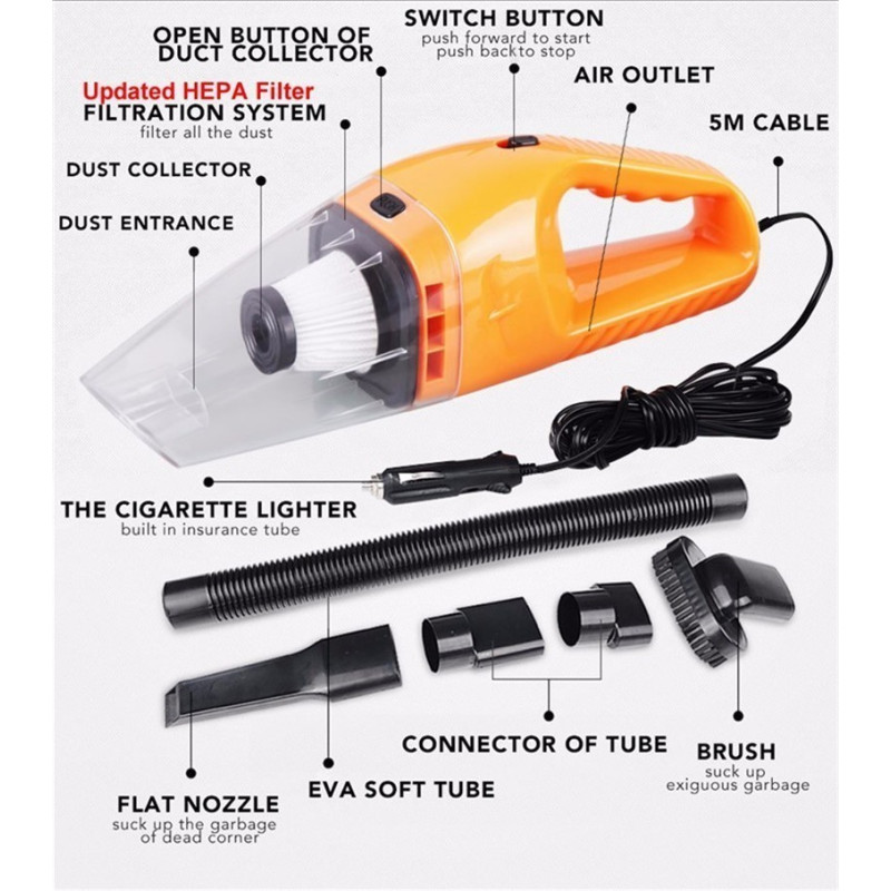 Тази прахосмукачка е предназначена за всякакъв тип автомобили и се отличава с компактен дизайн, който я прави изключително ефективна в събирането на прах, косми, кал и други замърсявания от пода на вашата кола. В комплекта са включени и три приставки, които ви позволяват да почиствате бързо и лесно широки места, ъгли и тесни пространства.