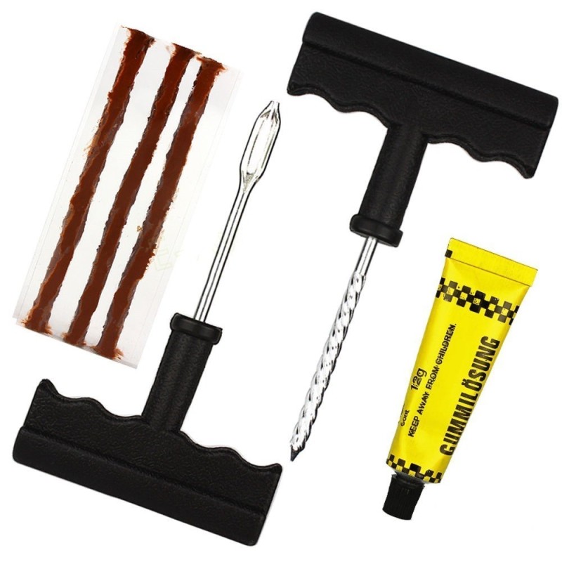 Комплектът включва всичко необходимо за успешен ремонт на гумата. Лепилото, шилата за поставяне на фитили и шилото за почистване на гумата са висококачествени и удобни за работа. Фитилите с дължина 100мм са подходящи за всякакви външни и безкамерни гуми.