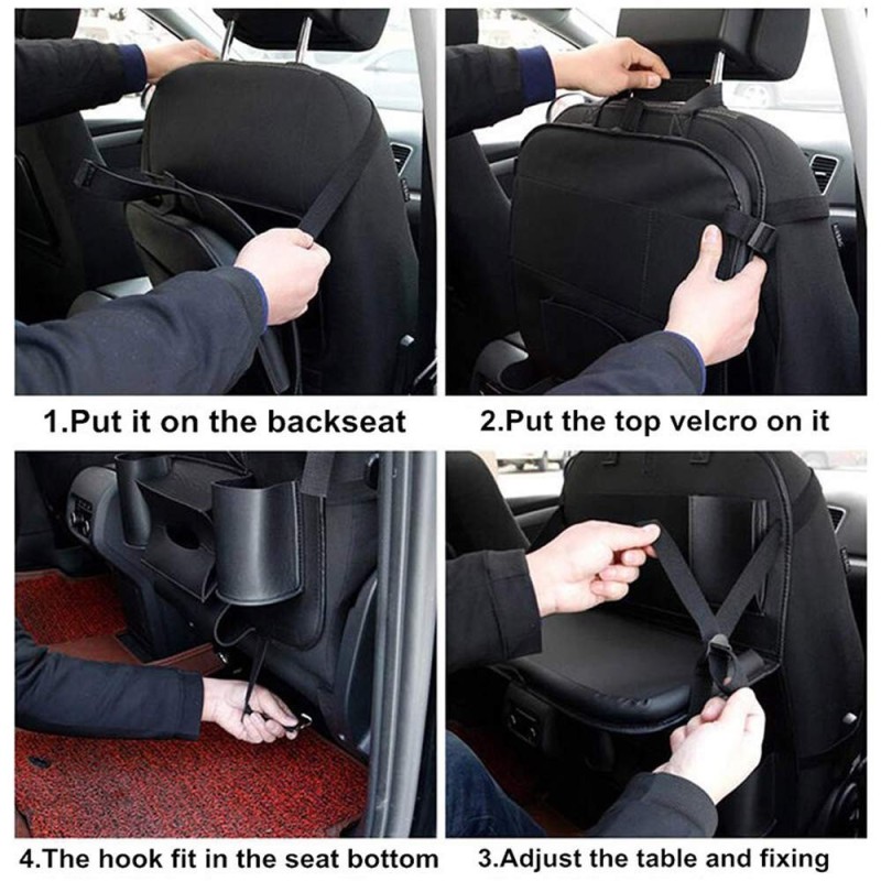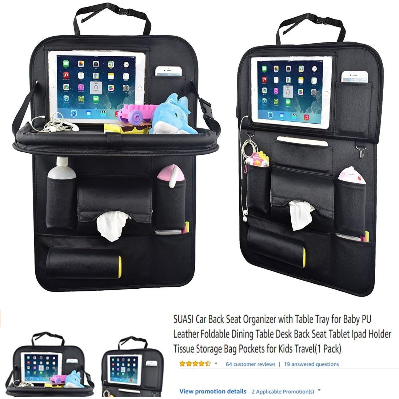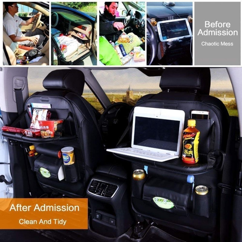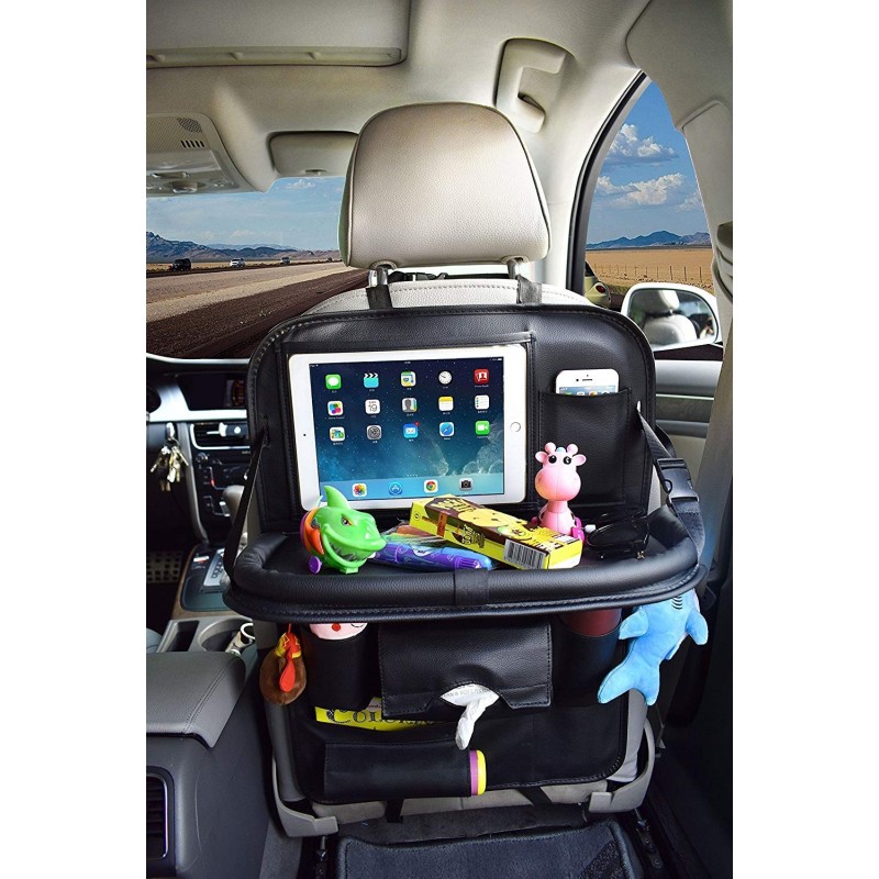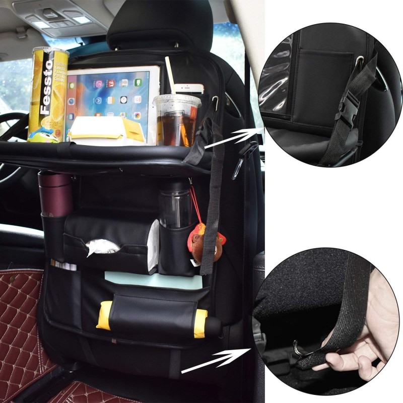 Със своите многофункционални отделения, този органайзер позволява да държите всичко на своето място по време на пътуване. Имате отделение, което се отваря и се превръща в малка масичка, идеална за поставяне на таблет, напитки или храна. Също така притежава и второ сгъваемо отделение, което може да се използва като кошче за малки отпадъци. Така можете да се отървете от опаковките на сандвичите или празните бутилки и кенчета без да се притеснявате за разхвърляни предмети.
