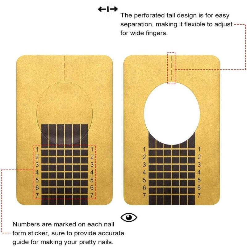 Този комплект съдържа 100 броя еднократни хартиени форми, които са идеални за изграждане на ноктопластика. Формите са изработени от гъвкав материал и се адаптират към всеки тип нокти. Те заемат желаната форма и след това се отстраняват лесно, без да нанасят щети на ноктите.