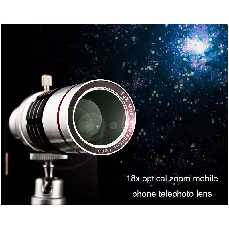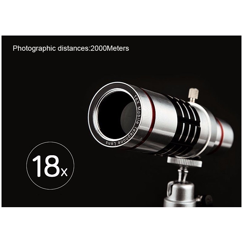 С помощта на алуминиевия телескоп с ръчно микро регулиране на фокуса, можете да увеличавате капацитета на способностите за заснемане на камерата на вашия мобилен телефон. Това ви позволява да получите близък изглед на предмети, без изкривяване на образа, дори на разстояние 18 пъти по-далеч от това, което вашият обектив може да приближи.
