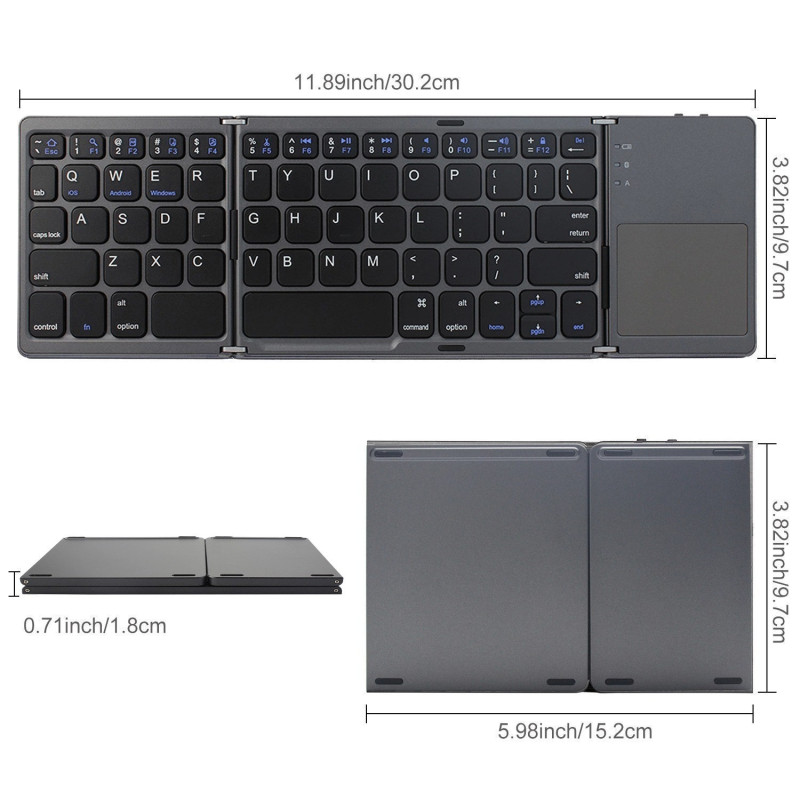 Сгъваемият дизайн на клавиатурата я прави изключително компактна и удобна за пренасяне. Изработена от алуминиев материал, тя е свръхтънка и с малък размер, който позволява лесно да бъде поставена в джоба ви. Когато е разгъната, размерите на клавиатурата са 304.5 * 97.95 * 18 мм, а размерите на тъчпада са 54.8 * 44.8 мм. Този изискан дизайн на клавиатурата е съчетан с изключителната изработка от алуминиев клас за самолет, която не само предлага превъзходна твърдост, но също така осигурява лекота и бързо разсейване на топлината. Благодарение на своя лъскав и елегантен дизайн, тази клавиатура ще добави стил и класа към работното ви пространство.