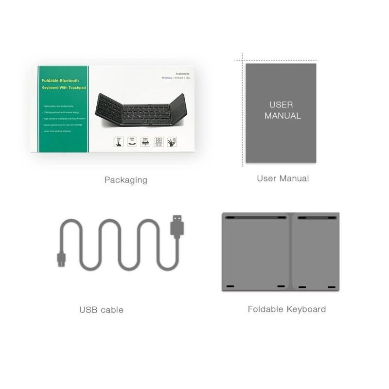 Комплектът включва сгъваема Bluetooth клавиатура с тъчпад и USB кабел за зареждане. Така ще можете да използвате клавиатурата навсякъде и по всяко време, без да се притеснявате от батерията.