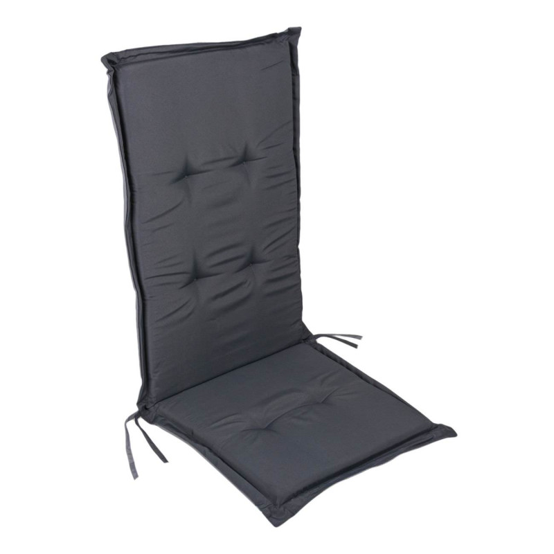 Възглавница за стол с облегалка, за открито, лятна декорация, антрацитно сива, двустранна, без цип. Изработена е от водоустойчива материя и шнурове от същата материя за здраво завързване.