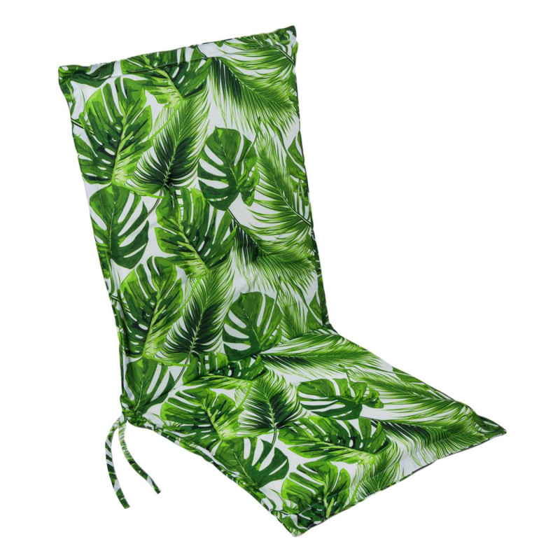Възглавница за стол с облегалка, за открито, лятна декорация, с дизайн на тропически листа, двустранна, без цип. Изработена е от водоустойчива материя и шнурове от същата материя за здраво завързване.