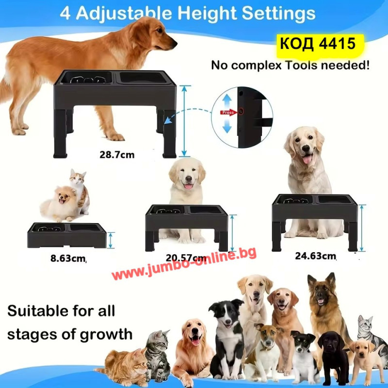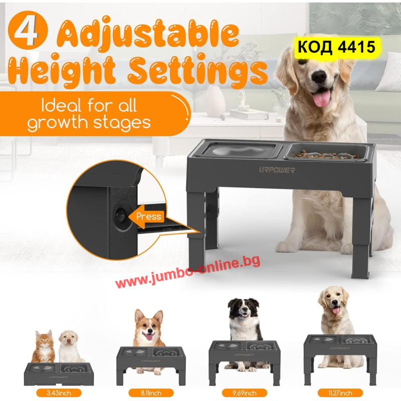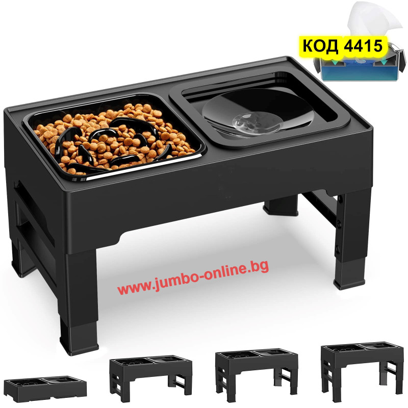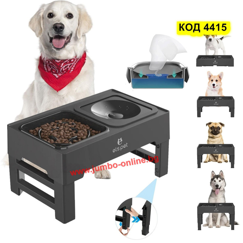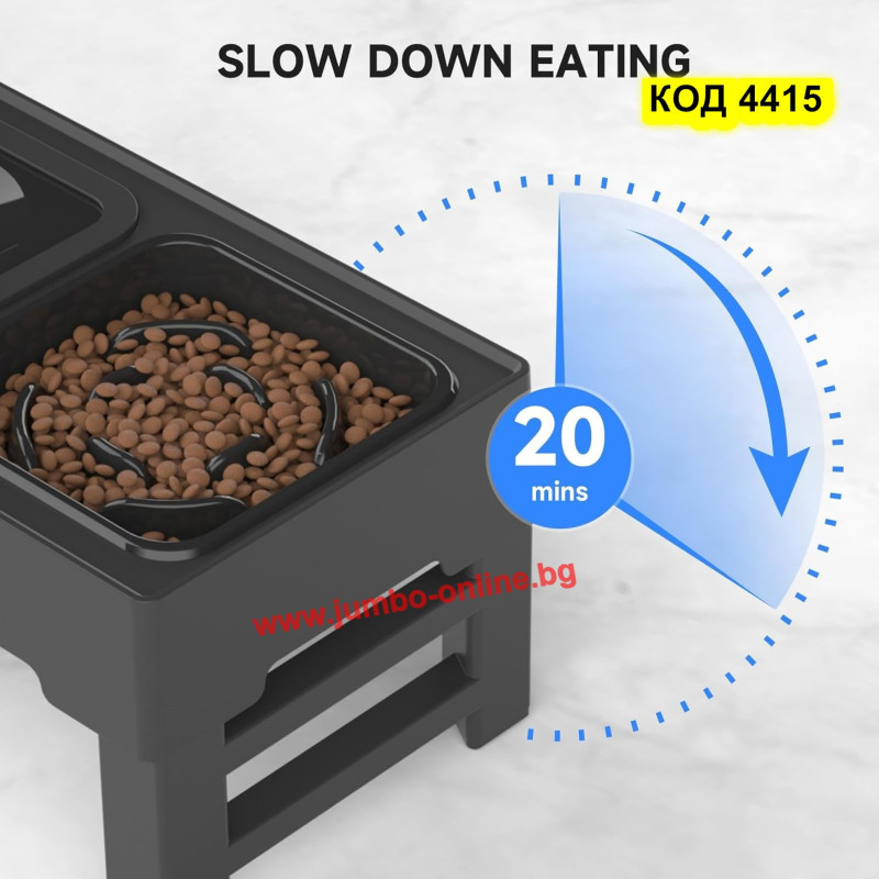 Купичка за бавно хранене за куче - Поставка с купички за кучета за бавно похапване на храната се регулира чрез просто натискане на бутони, разположени на краката - 4 нива на височина (8.7cm, 20.5cm, 24.5cm, 28.5cm) за домашни любимци на всяка възраст и размер. Това дава възможност да изберете правилната височина на хранене за вашия космат приятел и да гарантирате, че вашият домашен любимец се наслаждава на храната си удобно.