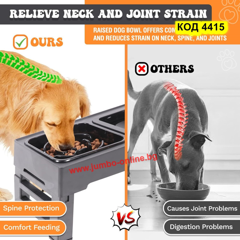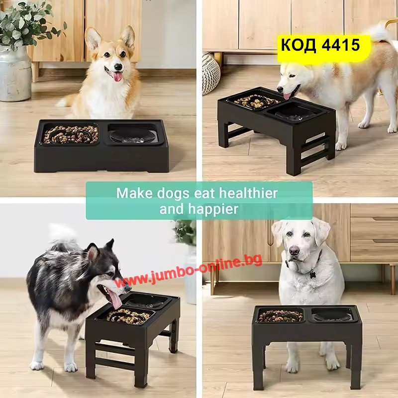 Намаляване на стреса върху шията, ставите и гръбначния стълб Стойката ефективно намалява напрежението върху врата, ставите и гръбначния стълб при хранене и пиене. Това насърчава здравословното храносмилане, като осигурява удобна височина за достъп до храна и вода. ВНИМАНИЕ: Монтирайте купата на нивото на лакътните стави на вашия домашен любимец. Тогава кучето ще яде удобно.