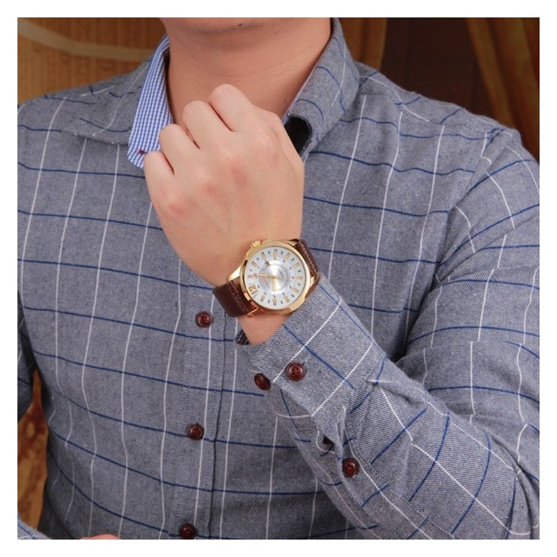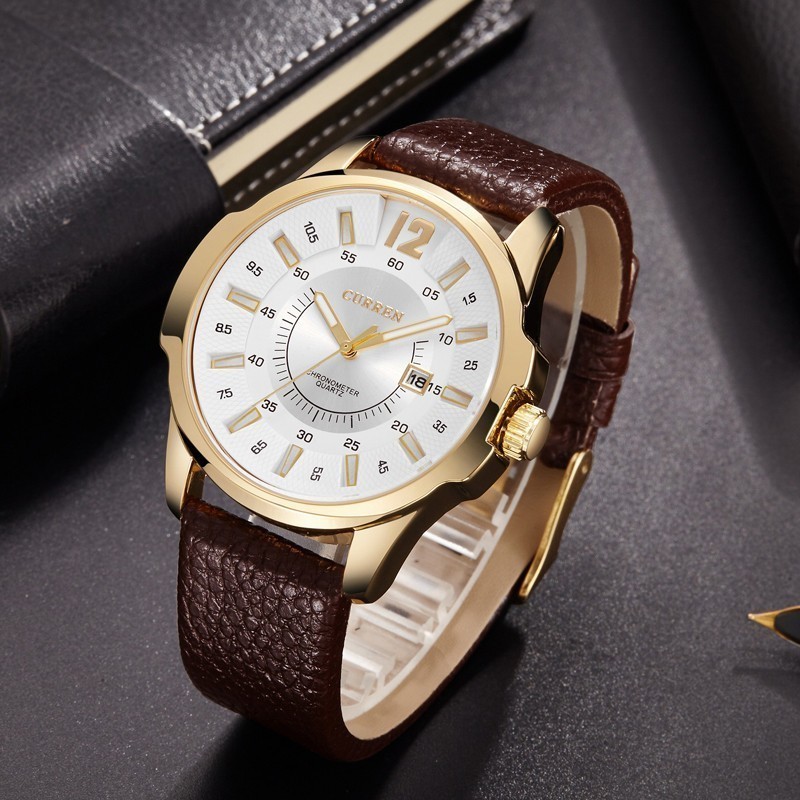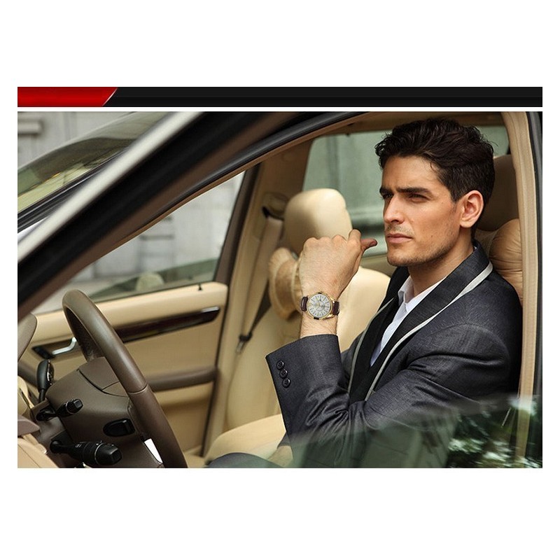 Часовникът разполага с изискан стоманен корпус в черен, сив или златист цвят, което му придава модерен и луксозен вид. Кожената каишка осигурява комфорт и издържливост, докато минералното стъкло е изключително устойчиво на надраскване.