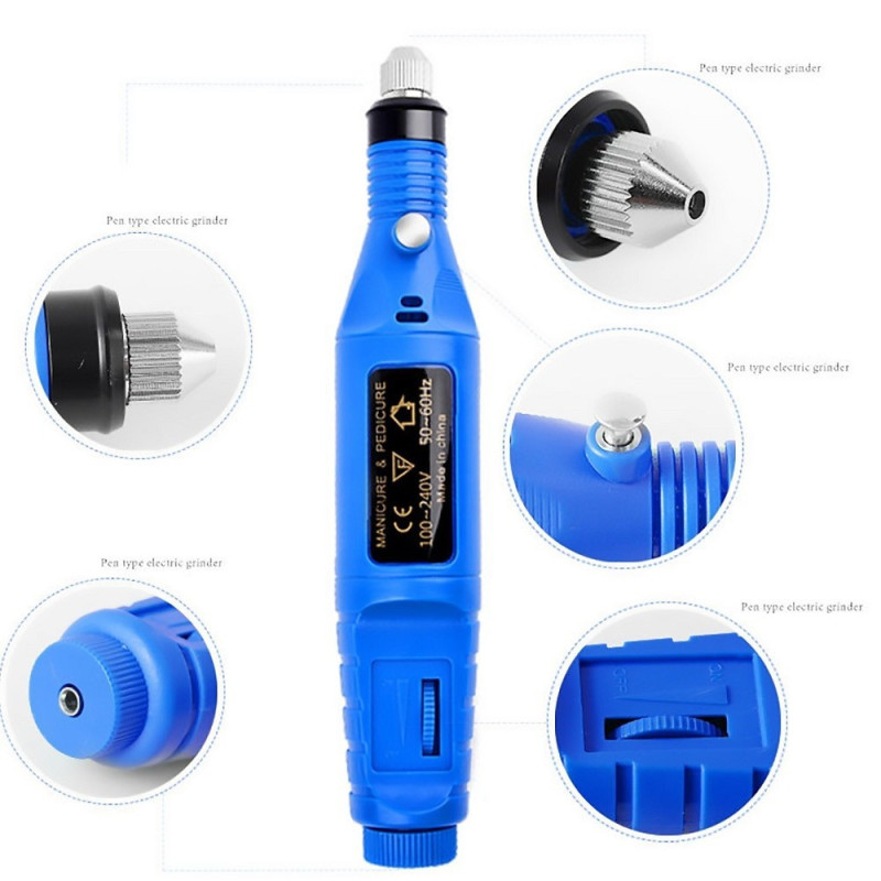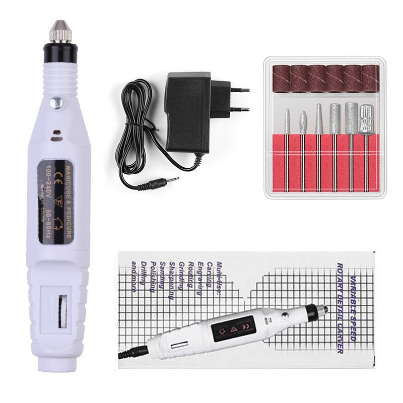 В опаковката ще намерите електрическа пила за нокти - писалка, както и 6 броя накрайници за пилене и 6 броя шлифовъчни пили. Захранващият адаптер за 220V също е включен.
