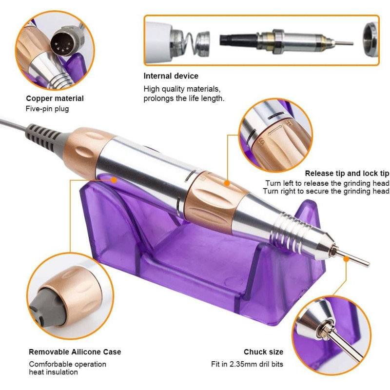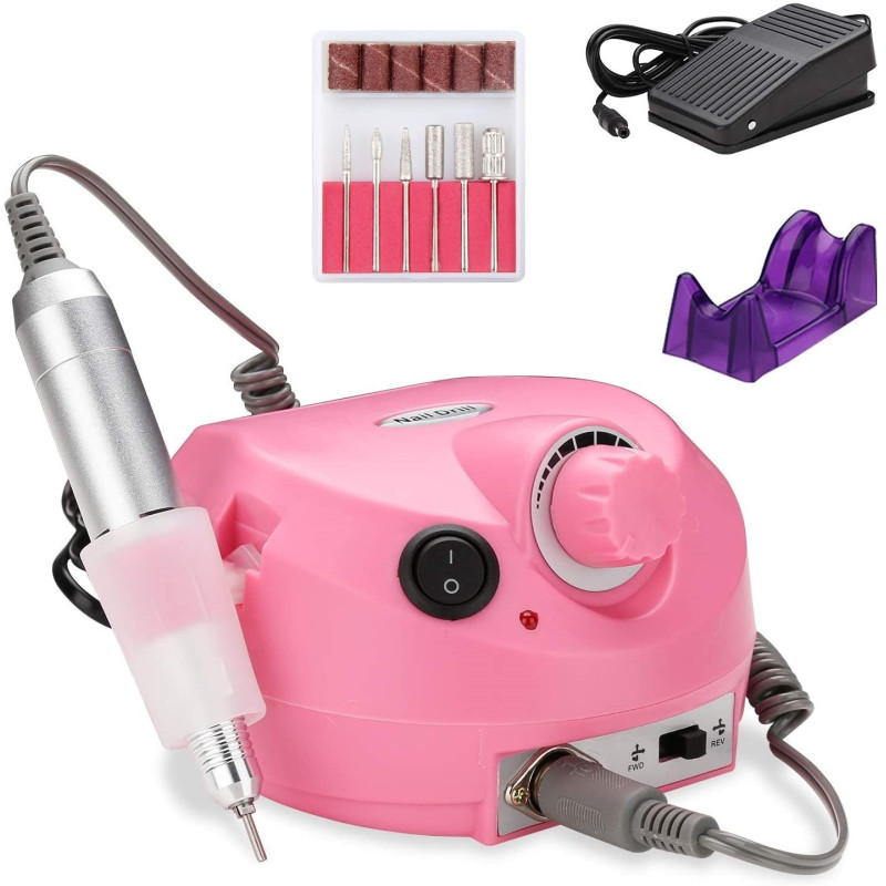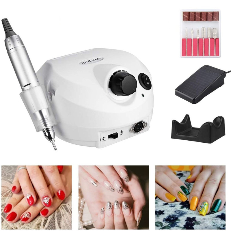 И не забравяйте, тази електрическа пила за маникюр и педикюр се предлага в комплект, който включва основно тяло, ръкохватка, крачен педал, стойка за ръкохватката, 6 броя накрайници и 6 броя шлайф шапки. Входящото напрежение е 220-240V / 50-60Hz, а изходящото напрежение е DC 18V. Мощността е варираща от 18 до 32 W, а оборотите са в диапазона от 0 до 30 000 оборота в минута.