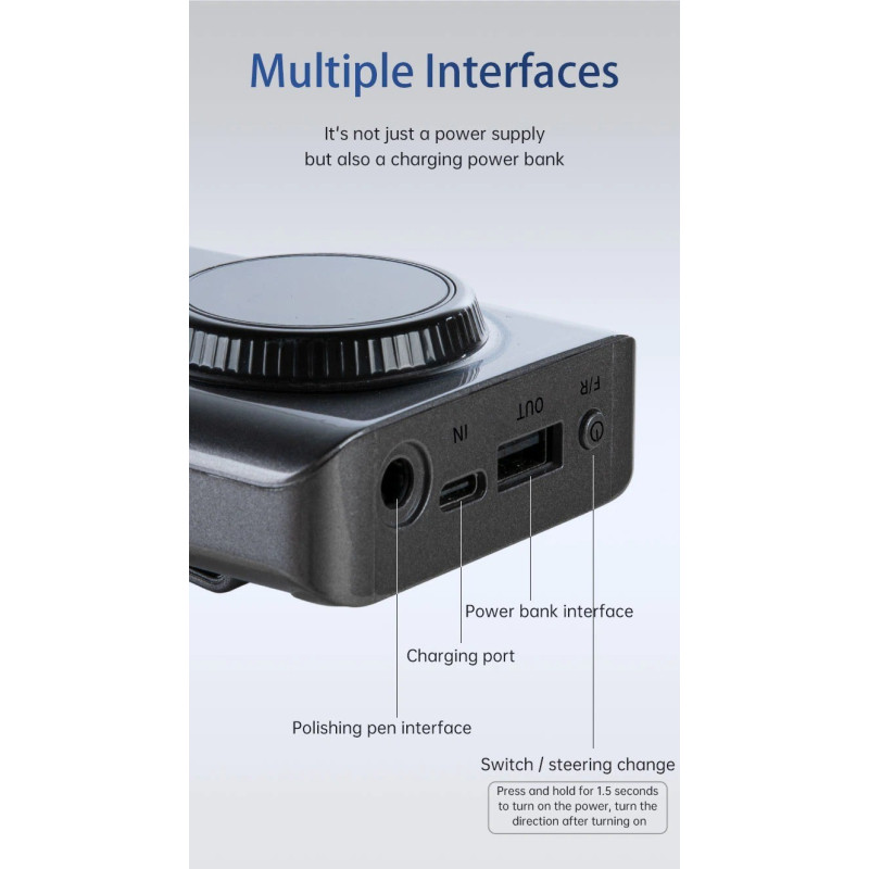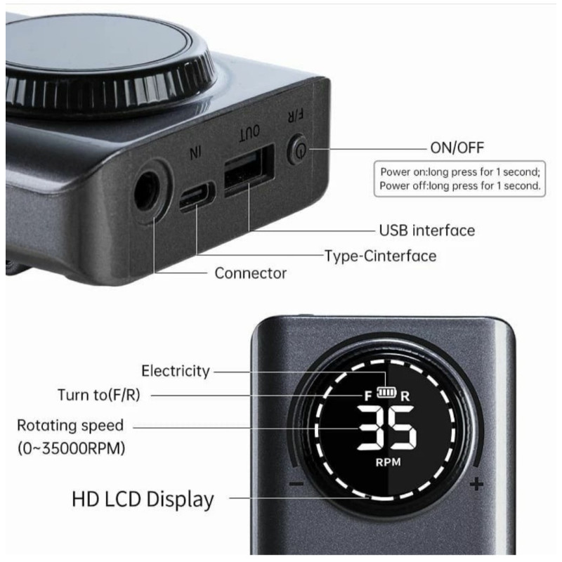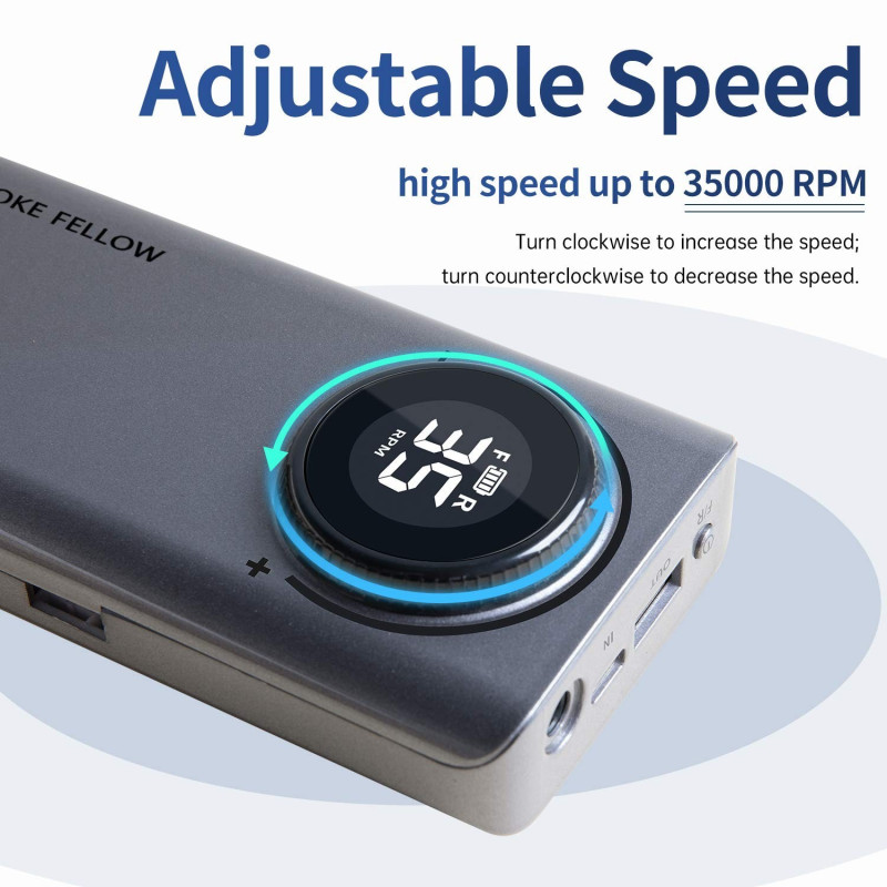 Комплектът включва основно тяло, писалка, 5 приставки, 5 шлифовъчни пили, стойка за писалката, разтегателен кабел за писалката и USB към Type C кабел за зареждане. Техническите характеристики на пилата включват мощност от 35W и скорост на въртене в диапазона от 0 до 35000 оборота. Размерите на корпуса са 13.8 х 6.9 см, а на писалката - 13.8 х 2.3 см. Батерията е с капацитет от 2600 mAh и се зарежда за около 3-4 часа. След пълното зареждане, пилата може да работи до 12 часа.