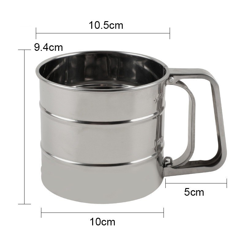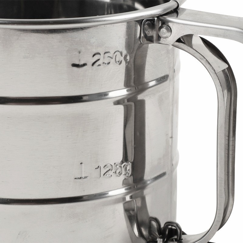 За вашето улеснение, чашата има скала за дозиране с вместимост 250 гр., което ви позволява да контролирате количеството, което искате да използвате. Изработена изцяло от неръждаема стомана, тази чаша сито е издръжлива и дълготрайна.