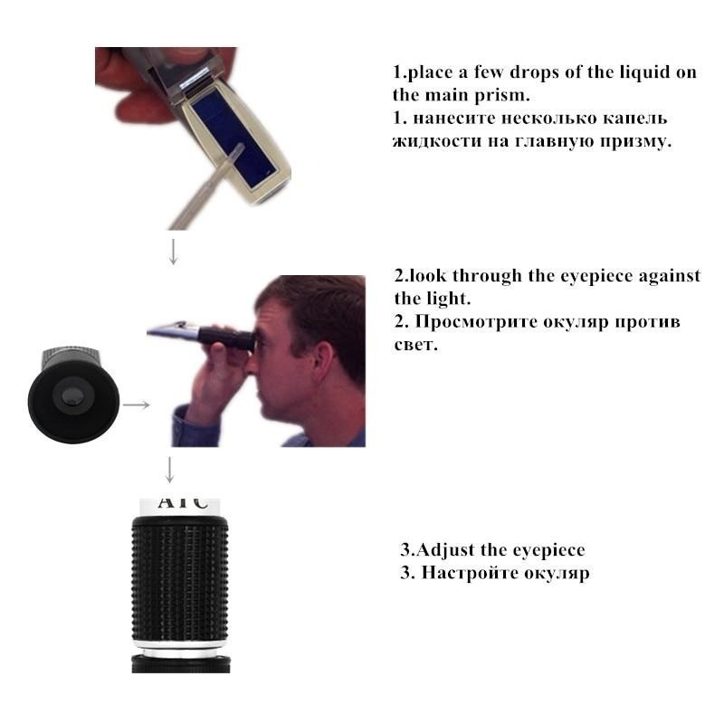 Скалата на рефрактометъра показва съдържанието на захари и потенциалния алкохол получен от тях. Най-висока точност при 20°С. Комплектът съдържа пластмасова кутия, рефрактометър, пипета за проби и отвертка за калибриране при необходимост.