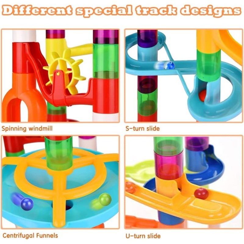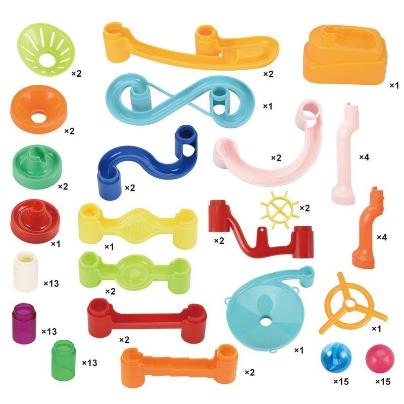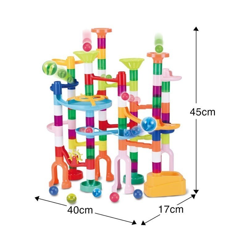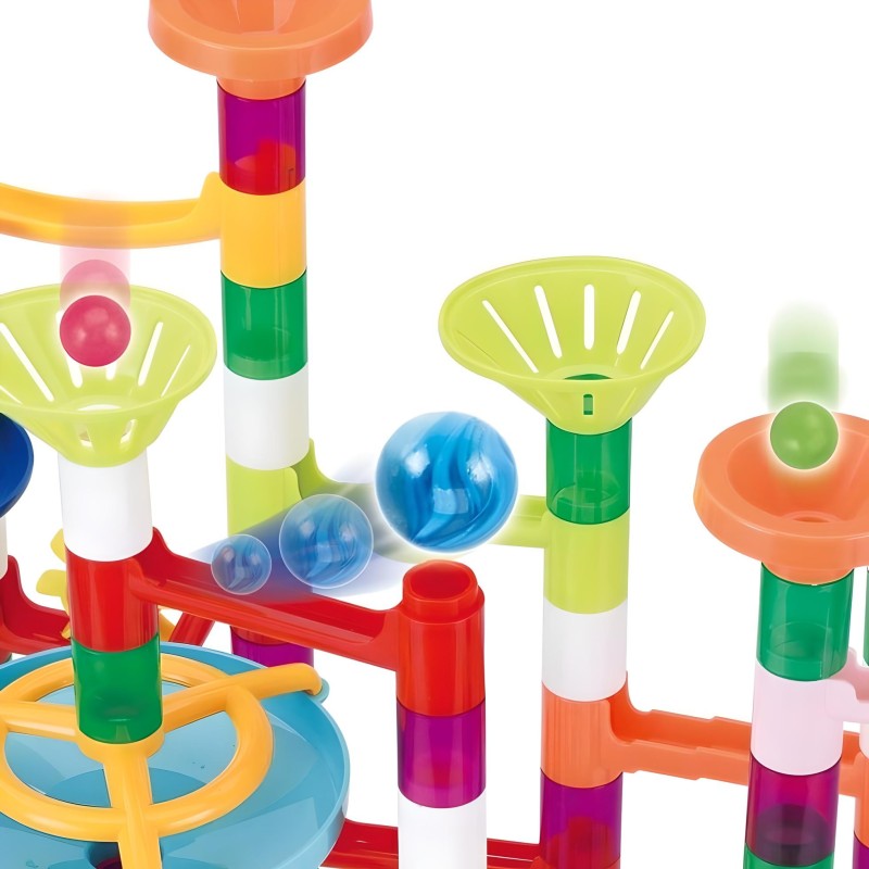 Знаете ли, че с няколко цилиндърчета, 3 основи-фунии и няколко зъбчати колела вашето дете ще може да построи истинска писта, по която да препускат не коли, a пъстри топчета и това да бъде толкова забавно и полезно, колкото и конструирането с най-сложни конструкторни части? Е, доказателство има и то и се нарича Marble Run писта / конструктор от 105 части, с която детето може да създаде истинско скоростно трасе с улеи, фунии и зъбчати колела, по които да се движат топчетата.