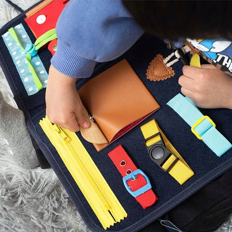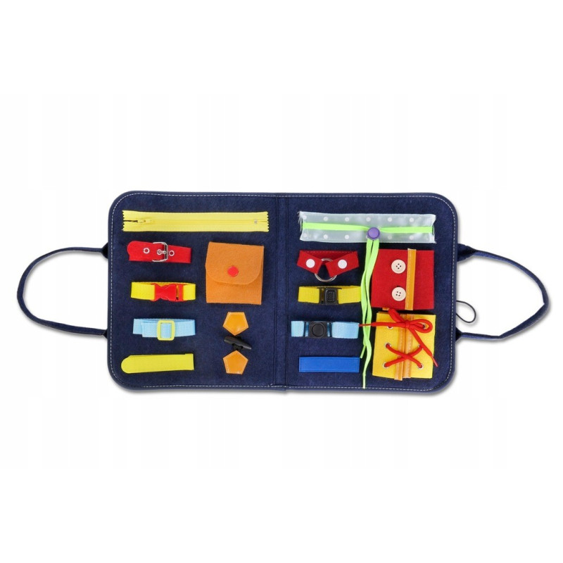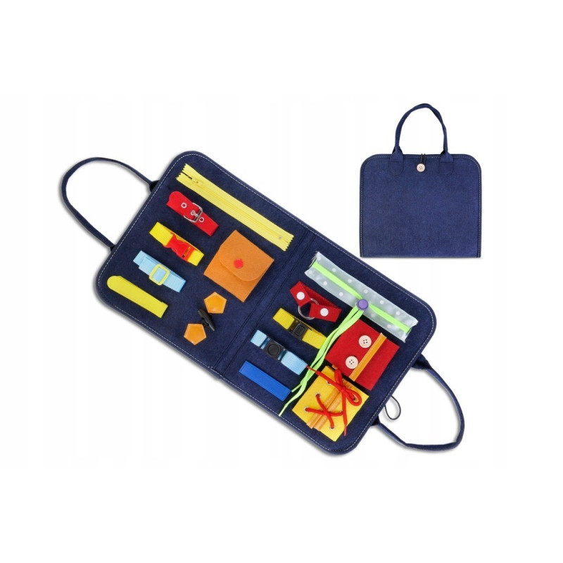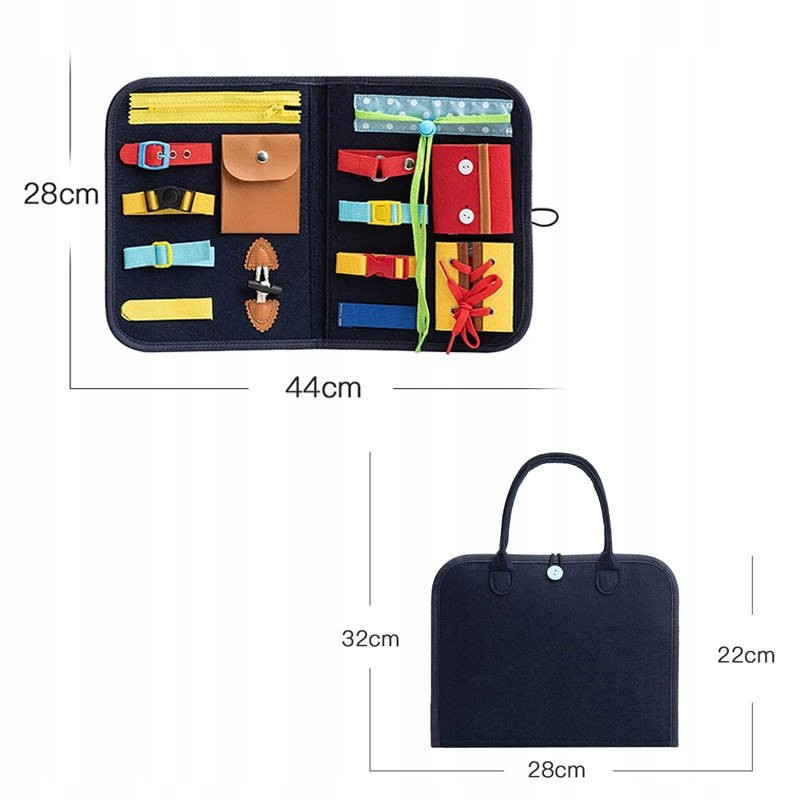 Чантата е с възможност за разширяване и съдържа различни елементи на ежедневното облекло, като копчета, ципове, велкро, закопчалки и колани. Това предоставя на детето възможност да се научи как да се облича самостоятелно. Играейки с манипулационната дъска, детето ще упражнява логическото мислене и моториката на пръстите си.