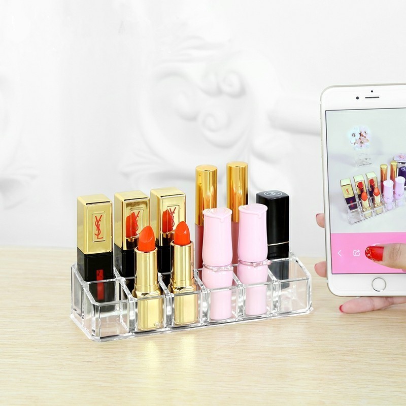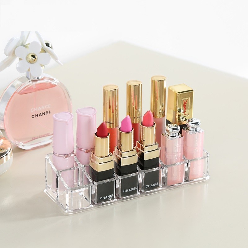 Дали искате да съхранявате своите червила и лакове по един организиран начин? Тогава този прозрачен органайзер е точно за вас! Създаден от здрав акрил, той предлага 12 отделения, които ще ви помогнат да подредите и съхраните вашите гримове на едно място.