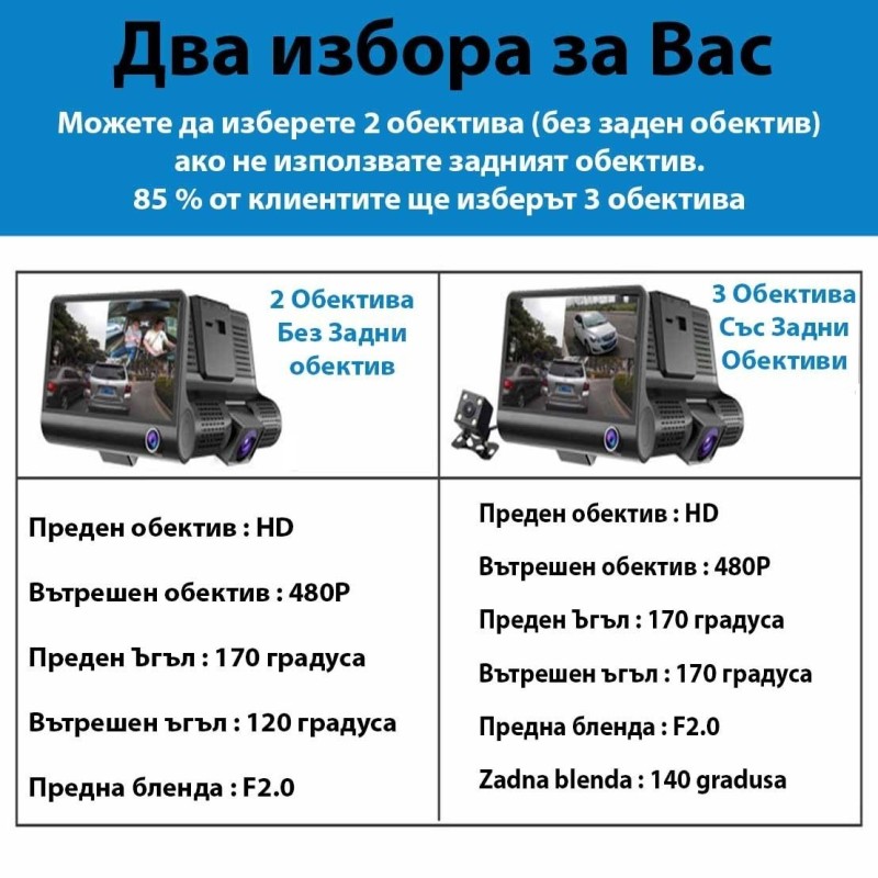 Основният акцент на този видеорегистратор е неговата висококачествена Full HD 1080p камера. Но това не е всичко - с 3 камери, той ви предлага пълен обхват на визуализацията на пътя. Предната камера осигурява широк ъгъл на снимане от 170 градуса, докато задната камера покрива 140 градуса, гарантирайки ви безопасно паркиране.