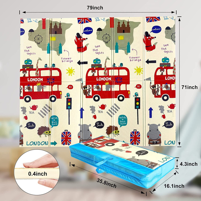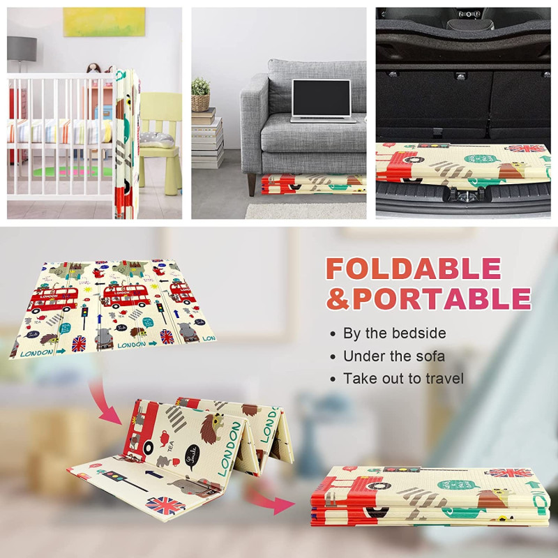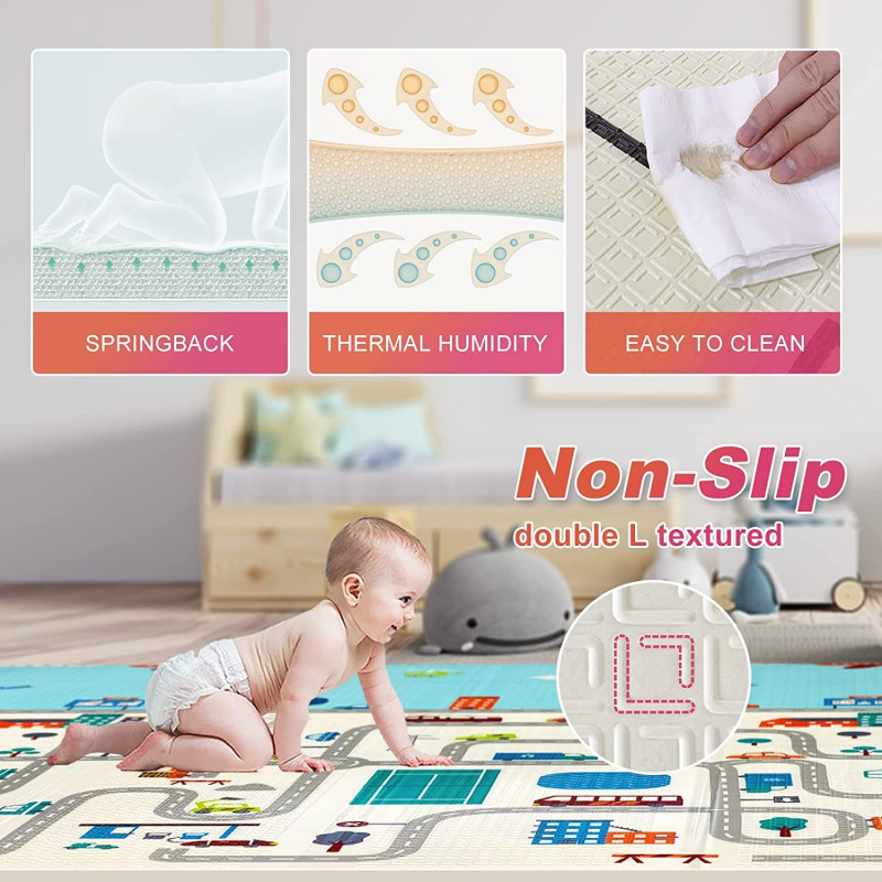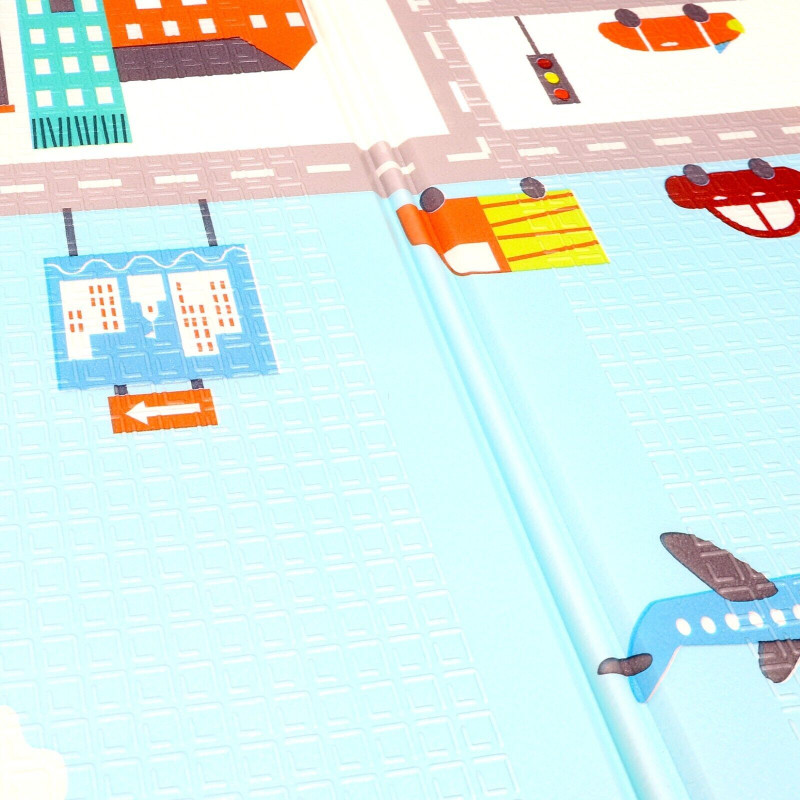 Двустранно, сгъваемо килимче за пълзене и игра от XPE пяна. Материалът, от който е изработено килимчето е нетоксичен и напълно безопасен, което го прави подходящ за употреба от деца, дори и в най-ранна възраст.
