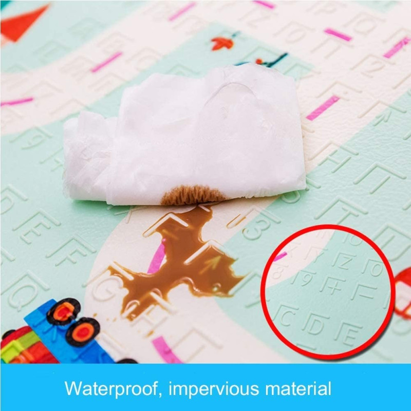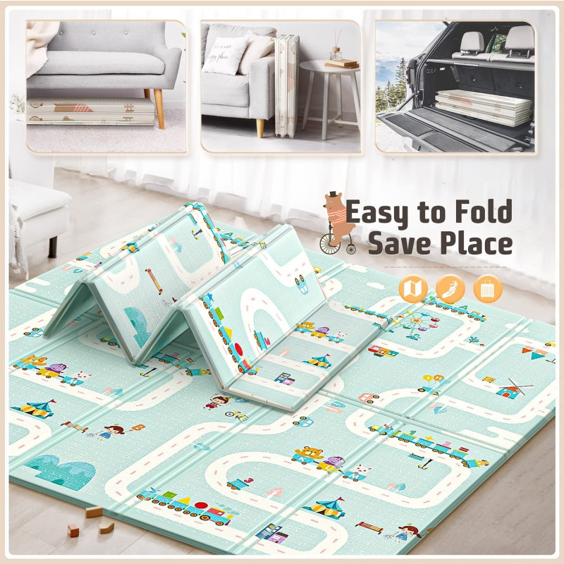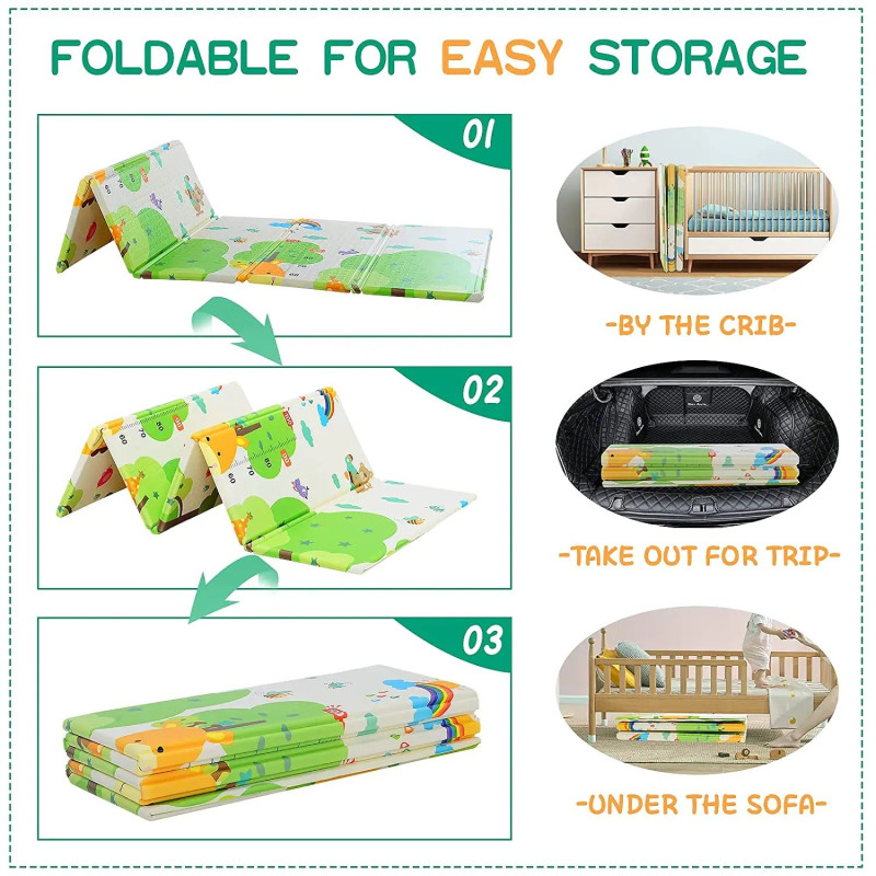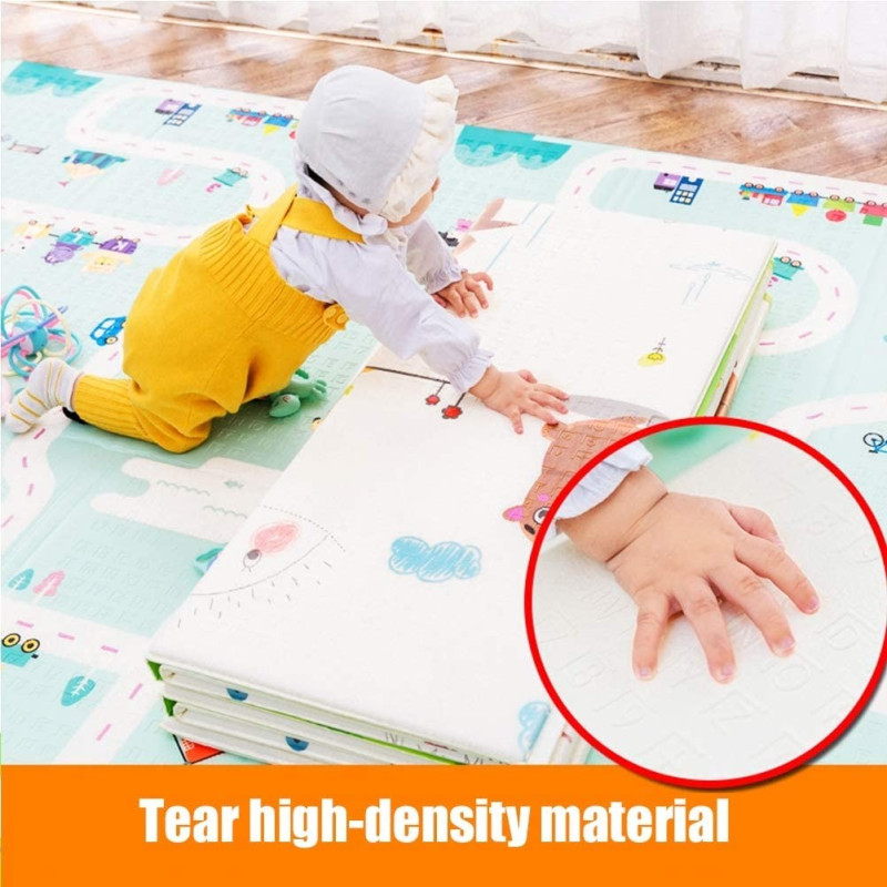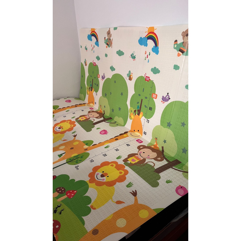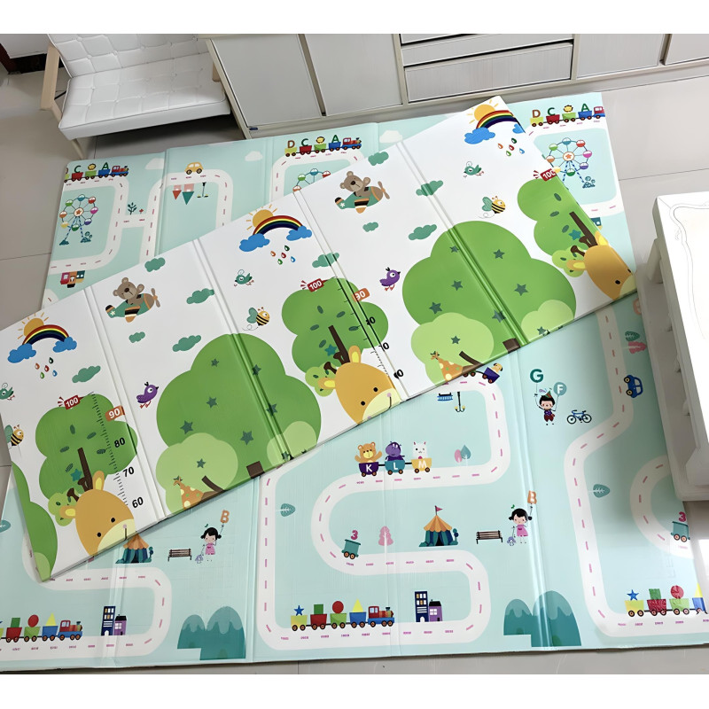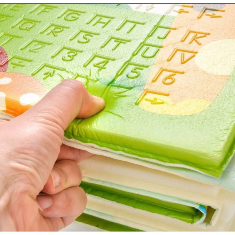 Двустранно, сгъваемо килимче за пълзене и игра от XPE пяна. Материалът, от който е изработено килимчето е нетоксичен и напълно безопасен, което го прави подходящ за употреба от деца, дори и в най-ранна възраст.