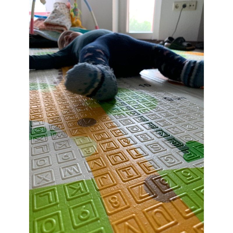 Килимчето изолира перфектно от студеният под. Меко е и комфортно, но в същото време достатъчно плътно и устойчиво на натиск. Чудесно буферира и обира удара при евентуално падане на детето. Осигурява защита на костното развитие на бебетата, като предпазва коленете при пълзене.