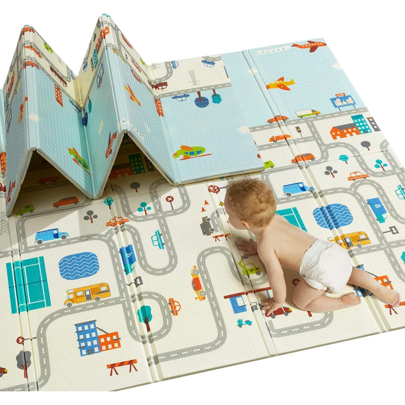 Двустранно, сгъваемо килимче за пълзене и игра от XPE пяна. Материалът, от който е изработено килимчето е нетоксичен и напълно безопасен, което го прави подходящ за употреба от деца, дори и в най-ранна възраст.