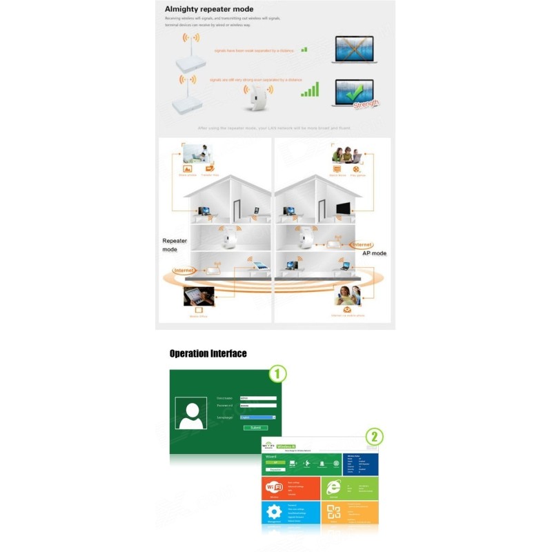 Със своите впечатляващи характеристики, усилвателят е съвместим със стандартите IEEE 802.11b/g/n, IEEE 802.3 и IEEE 802.3u. Това означава, че можете да го използвате като рутер, клиент, мост, повторител или AP модул - всичко, което ви е необходимо за да получите най-добрата възможна интернет връзка.