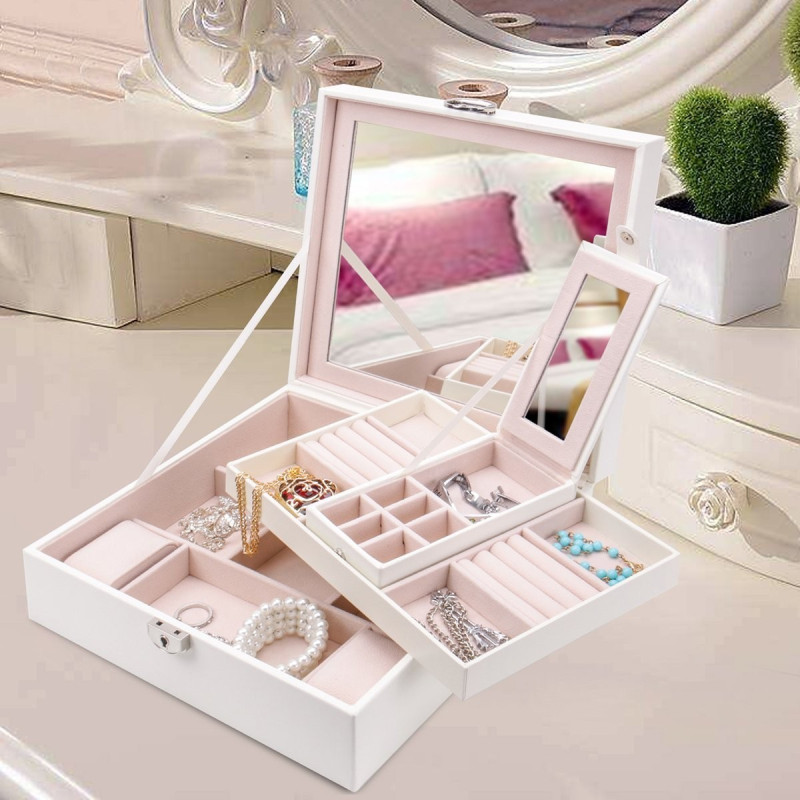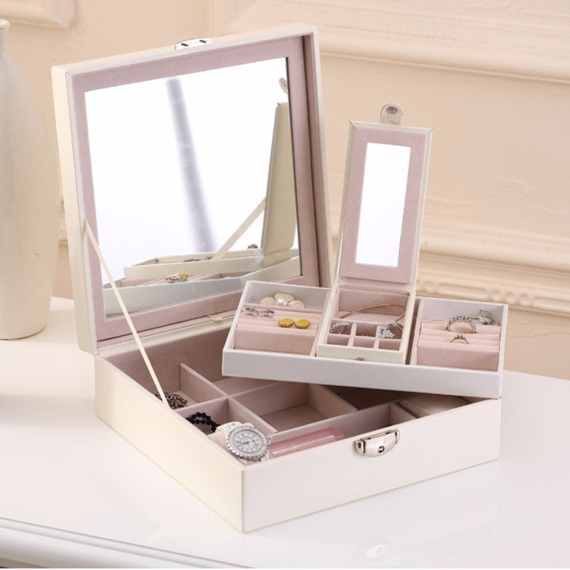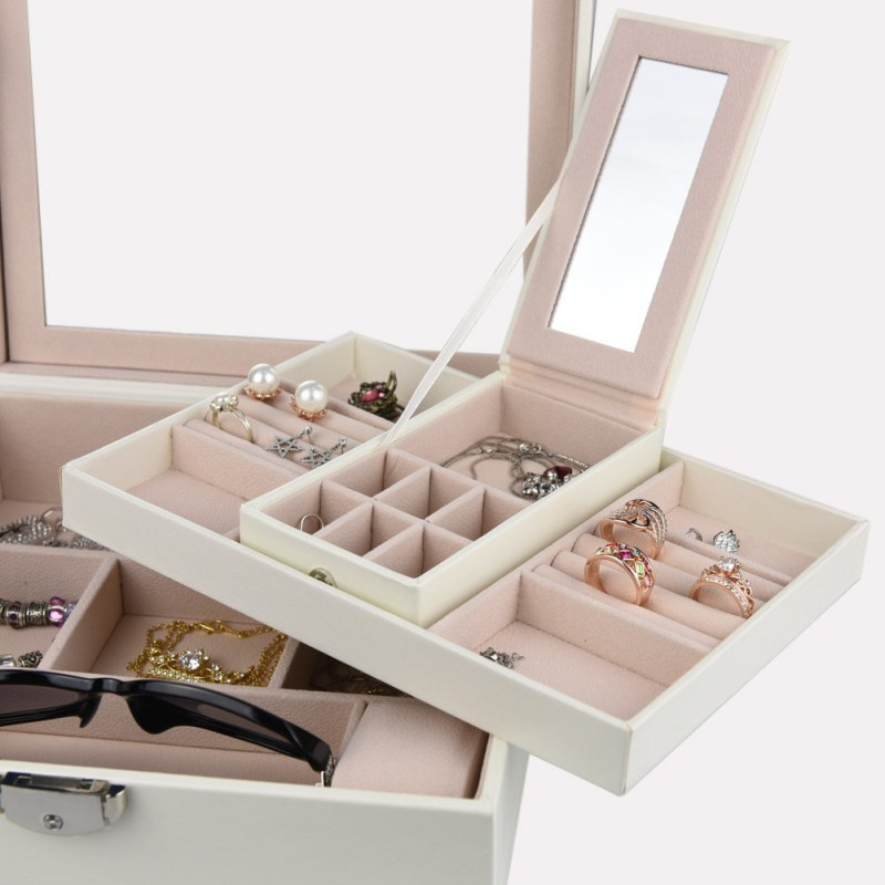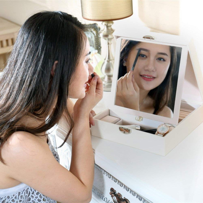 Вътре в кутията за бижута има накланящо се огледало. Перфектно за поставяне на бижута, както и за нанасяне на грим. Под огледалото има кутия за съхранение, която ще ви позволи да съхранявате най-ценните си бижута.
