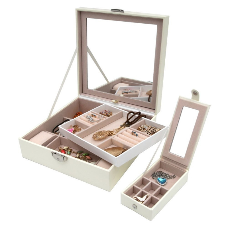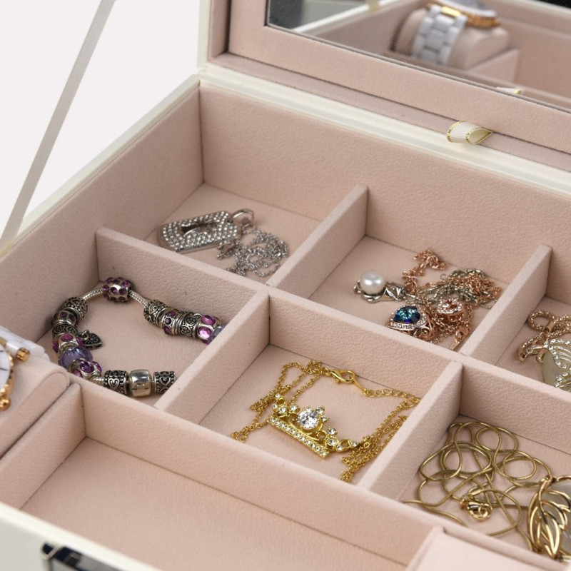 На първото ниво има подвижен капак, затворен с резе. Разполага с 6 по-малки отделения и 1 голяма. Перфектен за вземане на няколко колиета, обеци, пръстени или гривни на пътуване.