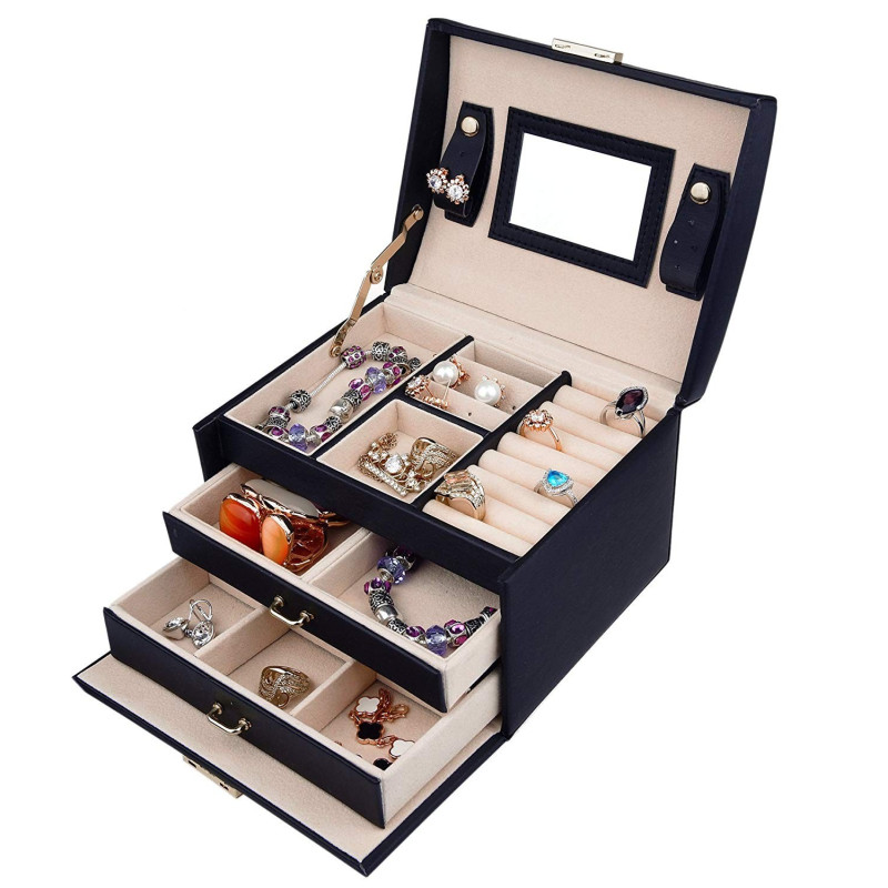 Тази практична кутия за бижута има 20 различни отделения и държка, които ще Ви позволят да организирате колекцията си и да контролирате всеки потенциален хаос. Тя има две чекмеджета и един скрит рафт под горния капак. Отделенията са с различни размери. Някои от тях са достатъчно големи, за да съхраняват часовници, гривни, колиета, обеци или дори вашите USB с важни данни.