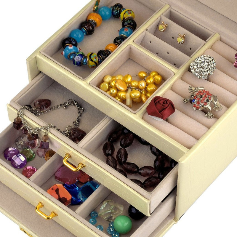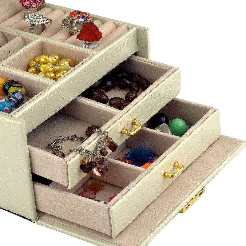 Кутиятя за бижута може да се заключва с ключ. Това е много функционално решение. Ключът гарантира, че само Вие можете да използвате бижутата. Бравата гарантира защита срещу потенциална кражба. Интериорът е безопасен за деликатни и скъпоценни бижута, тъй като е подплатен с мек и удобен материал, който свежда до минимум риска от драскотини или микроповреждания.