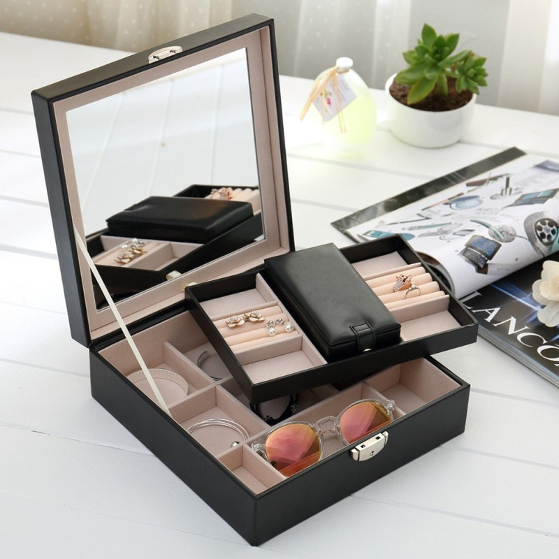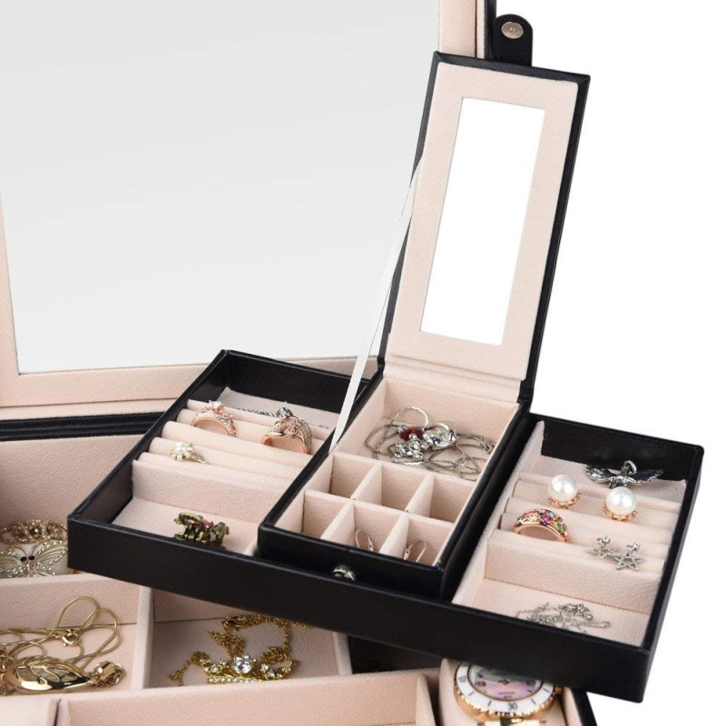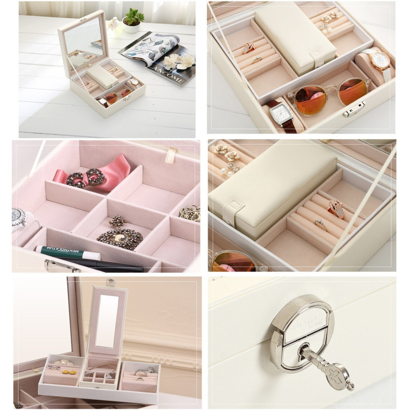На първото ниво има подвижен капак, затворен с резе. Разполага с 6 по-малки отделения и 1 голяма. Перфектен за вземане на няколко колиета, обеци, пръстени или гривни на пътуване.