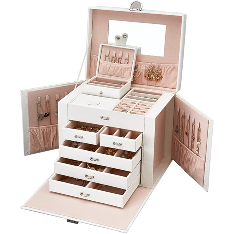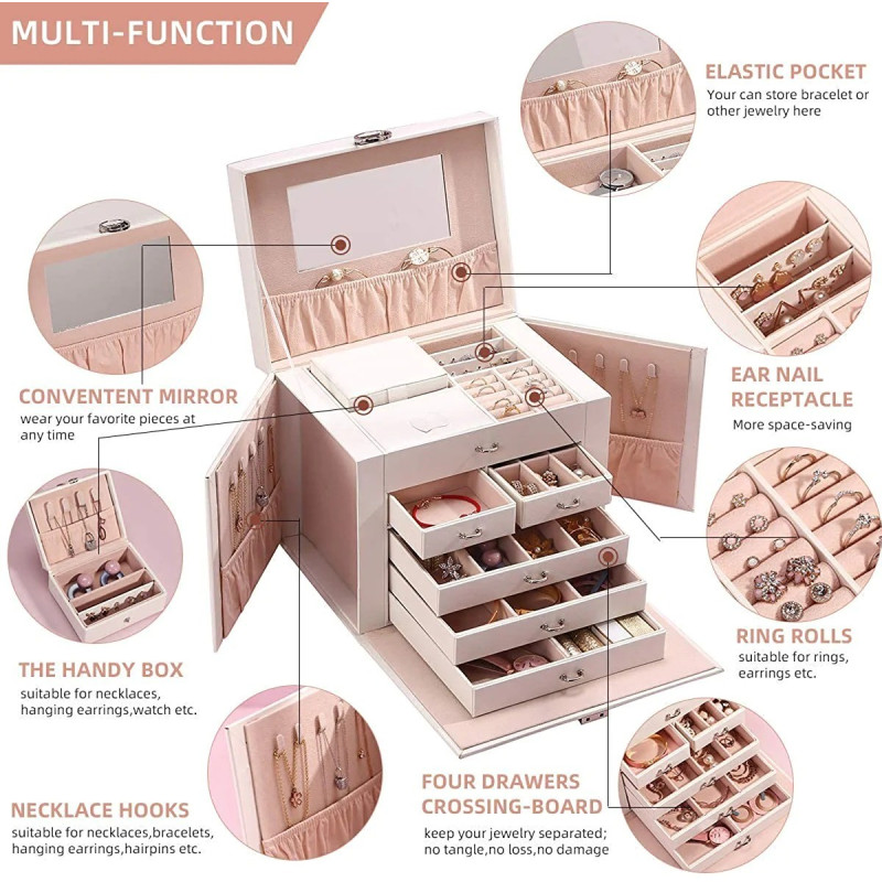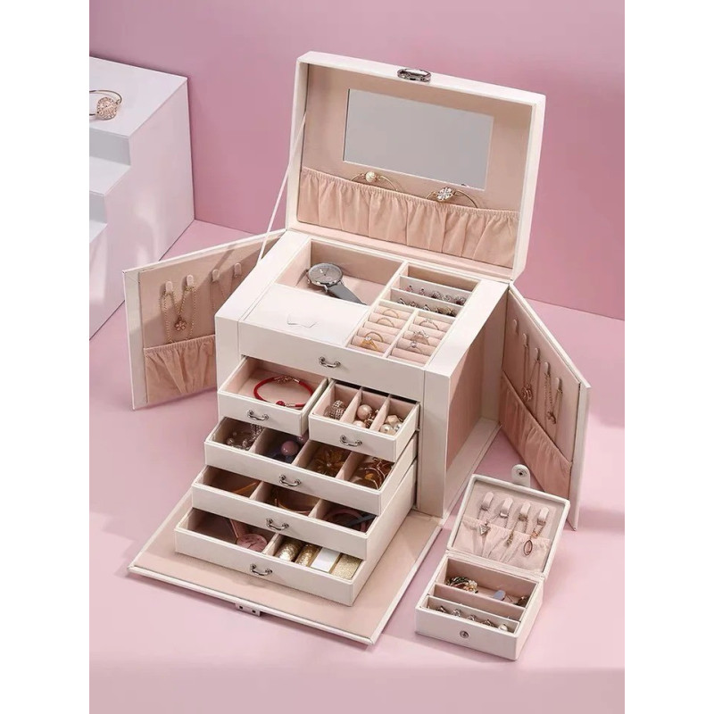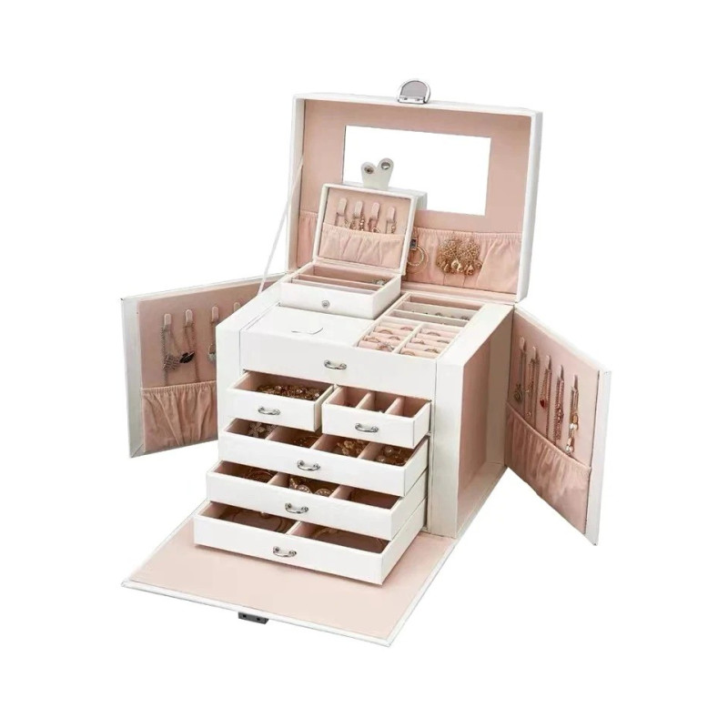 5 плъзгащи се чекмеджета, 20 отделения, 10 кукички за огърлици, 3 големи прегради за съхранение. Подплатени с мек велур и PU кожена външност.