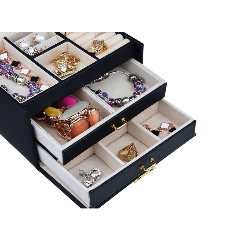 Тази практична кутия за бижута има 20 различни отделения и държка, които ще Ви позволят да организирате колекцията си и да контролирате всеки потенциален хаос. Тя има две чекмеджета и един скрит рафт под горния капак. Отделенията са с различни размери. Някои от тях са достатъчно големи, за да съхраняват часовници, гривни, колиета, обеци или дори вашите USB с важни данни.