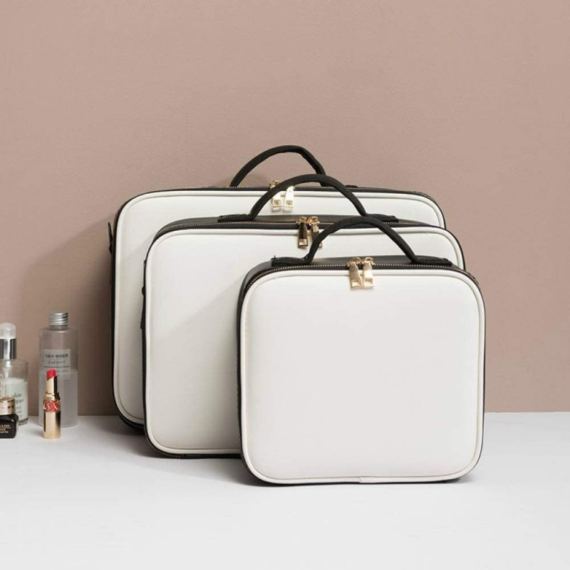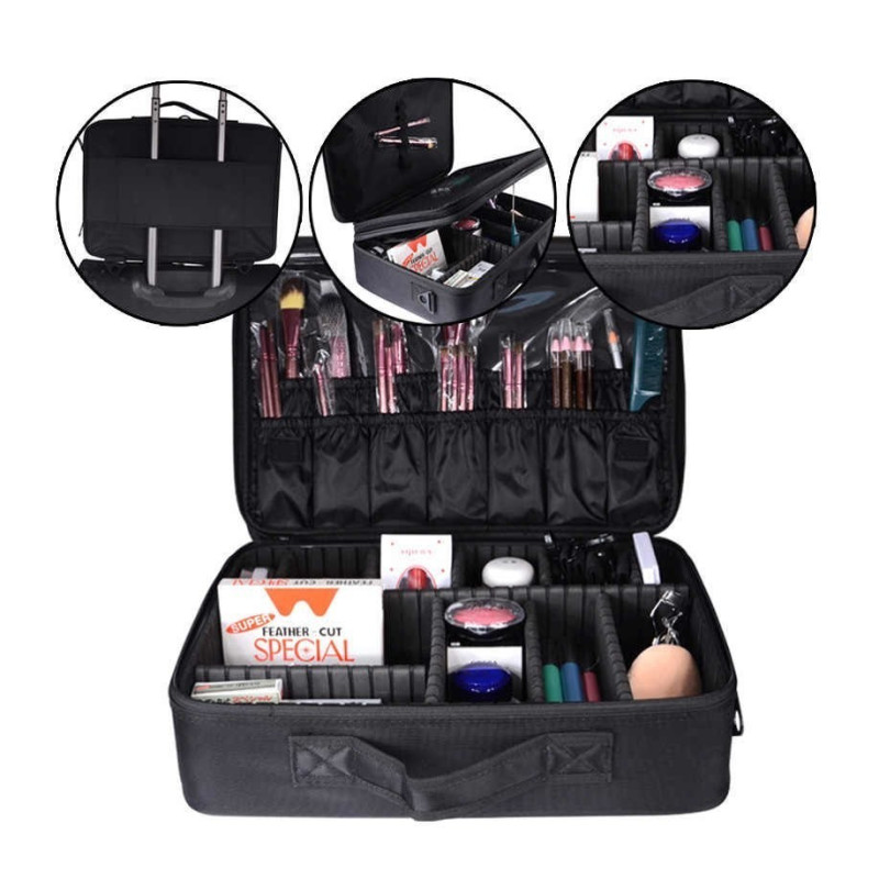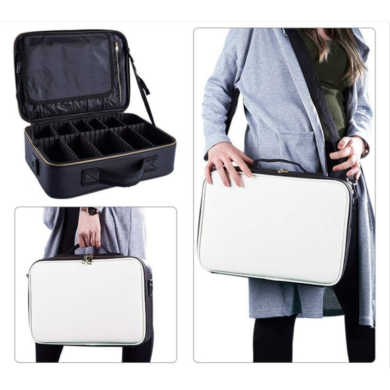 С 3 отделения с цип, можете да съхранявате и пренасяте своите продукти със сигурност и удобство. Удобните дръжки и презрамката за носене гарантират, че можете да вземете куфара със себе си навсякъде, без да усещате тежестта му.