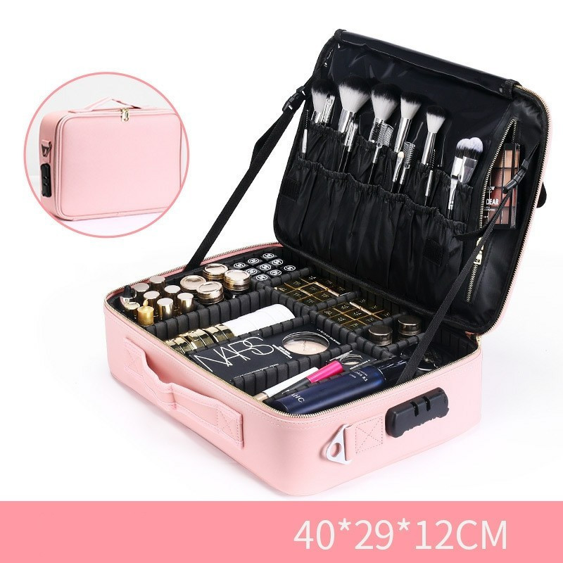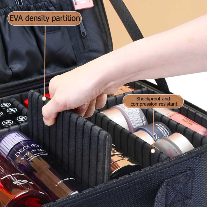 Изработен от висококачествен и устойчив материал, този куфар е създаден да издържи на интензивна употреба и да защити вашия любим грим и козметика. Големите и малките отделения ви позволяват да организирате продуктите си по начин, който ви удовлетворява най-добре. Особените отделения за четки за грим ви дават възможност да ги съхранявате безопасно и да предотвратите нежелани повреди. Подвижните прегради ви дават възможност да променяте размерите на отделенията според вашия избор.