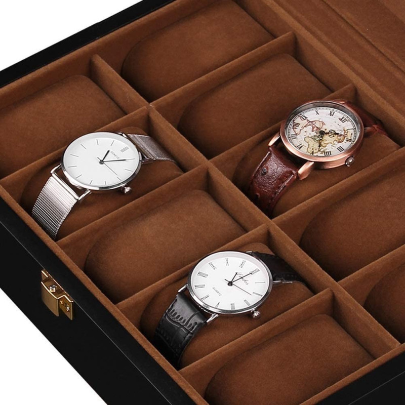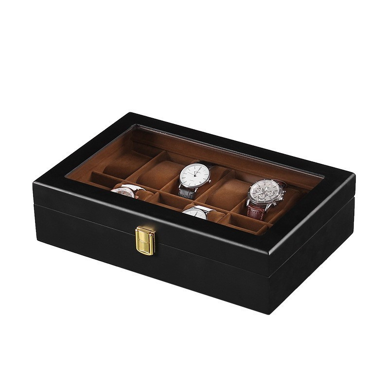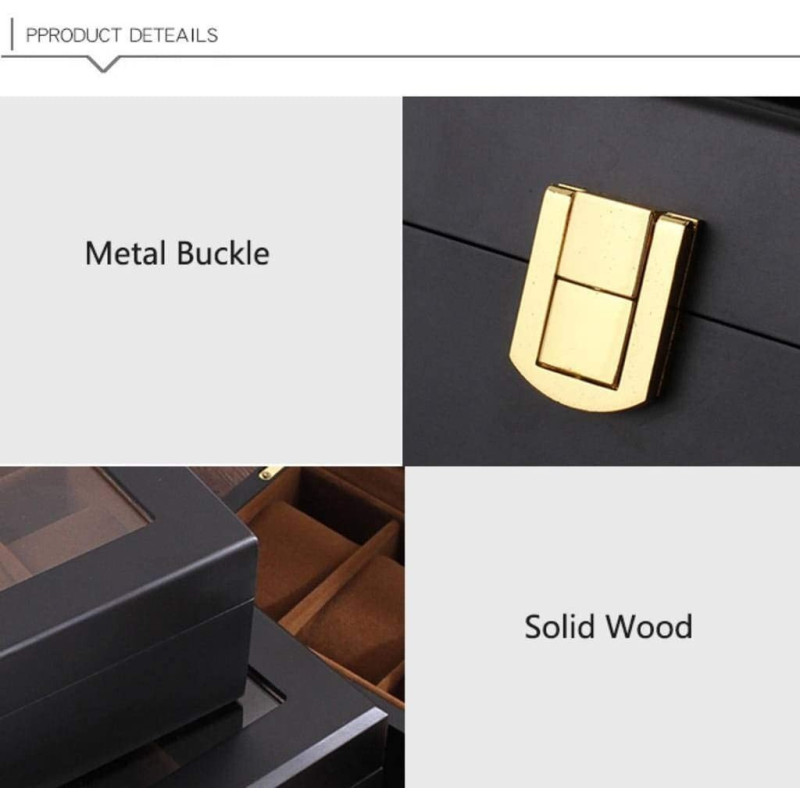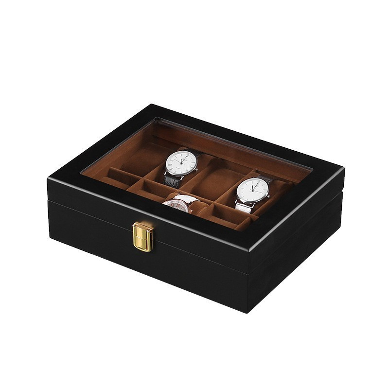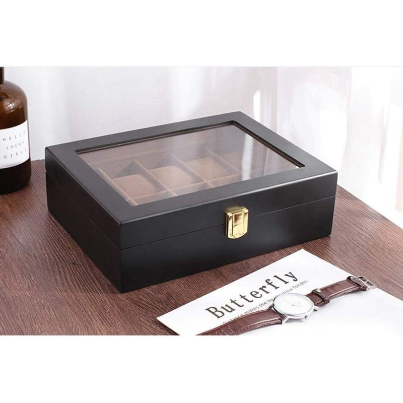 Представяме Ви елегантната черна дървена кутия за часовници с 6, 10 или 12 отделения. Тази изтънчена кутия е идеалното решение за съхранение на Вашите ръчни часовници, гривни и други бижута и аксесоари.