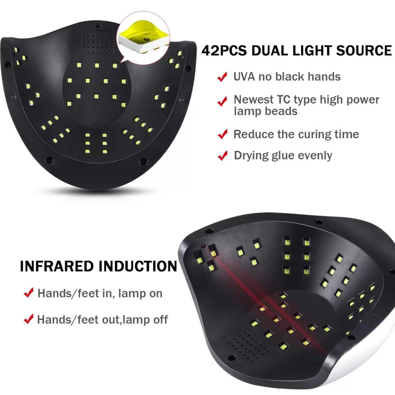 С мощност от 220W и 42 диодни лампи, тази комбинирана лампа на SUN ви осигурява бързо и ефективно изпичане на всеки гел лак или гел. С нейната помощ, вашите нокти ще излъчват перфектен блясък и ще имат дълготрайна издръжливост.