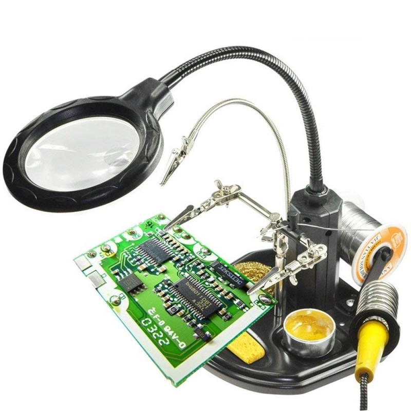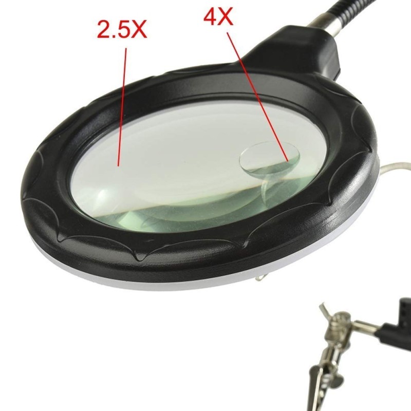 Представяме ви настолната лупа с лампа, трета ръка и увеличение 2.5X - идеалният помощник за всеки, който работи с малки предмети и запоява микросхеми или части. Забравете за дискомфорта и умората от държане на елементите под ъгъл, защото третата ръка с лупа и осветление е тук, за да ви помогне.