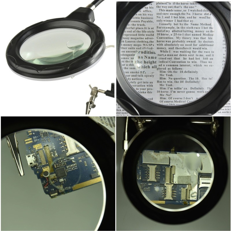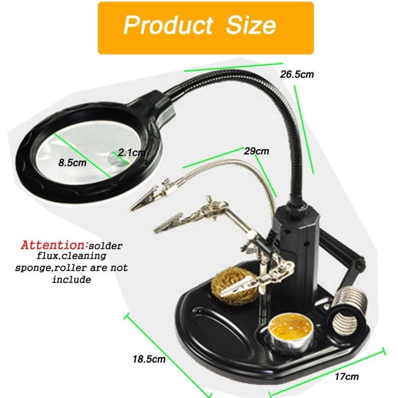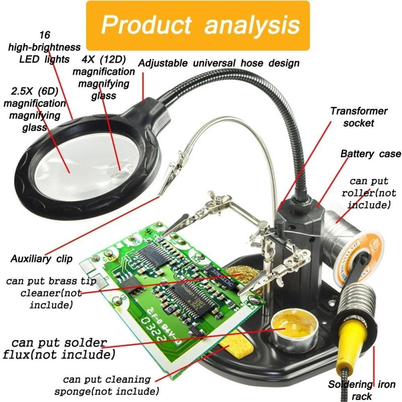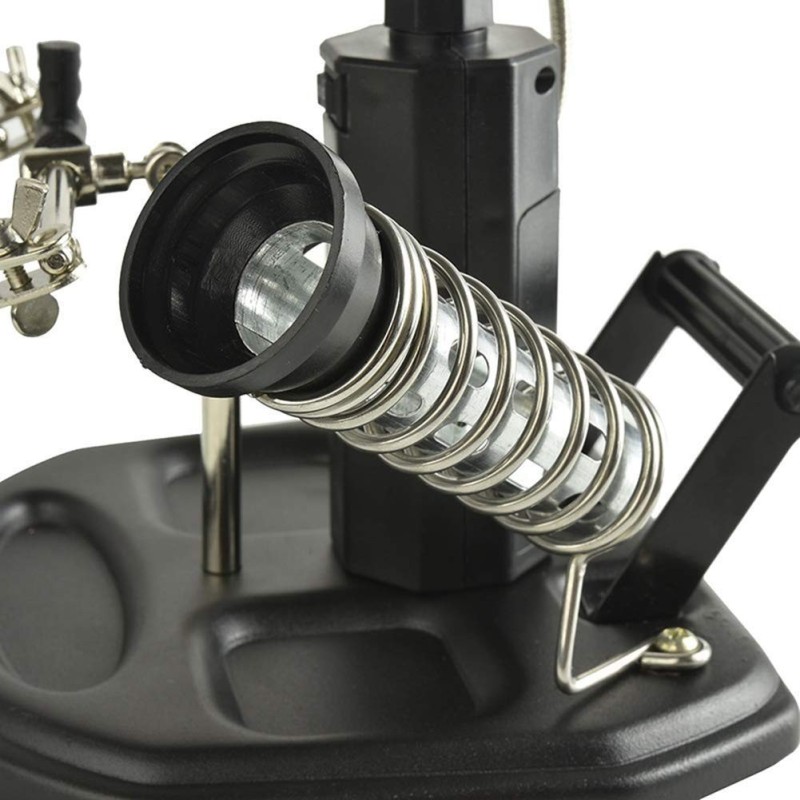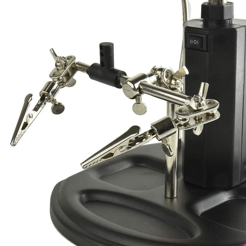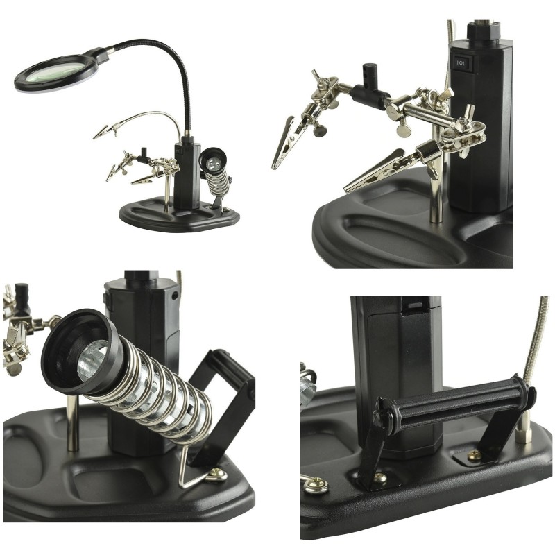Тази иновативна трета ръка ви позволява да фиксирате частите неподвижно с помощта на скобите (крокодилите), докато вие се концентрирате върху работата. Осигурявайки висококачествено увеличение на обекта, вие ще можете да видите всеки детайл без значение на размера му. В комплекта включени са две допълнителни мини-лещи с диаметър 35 мм и увеличение 2х или 5х, които можете да инсталирате под основната лупа за още по-голямо увеличение.