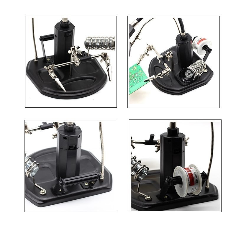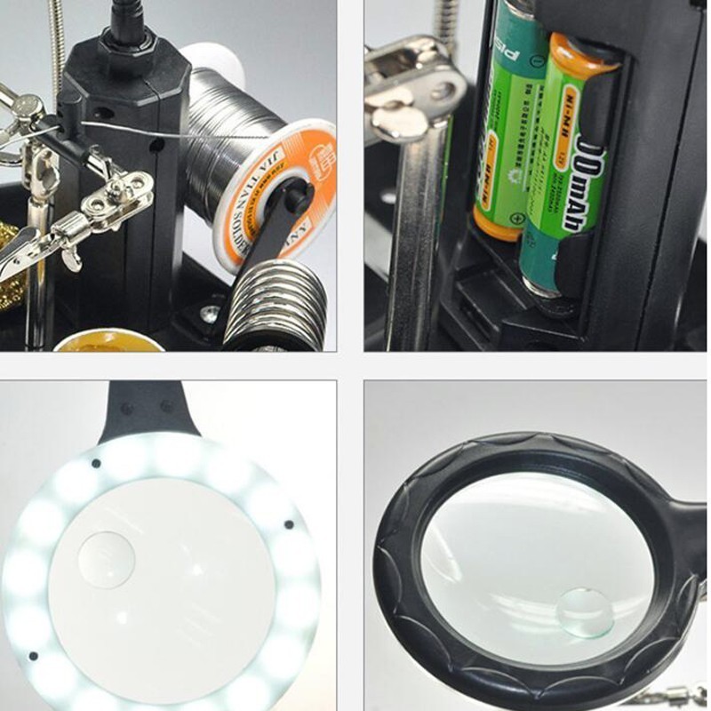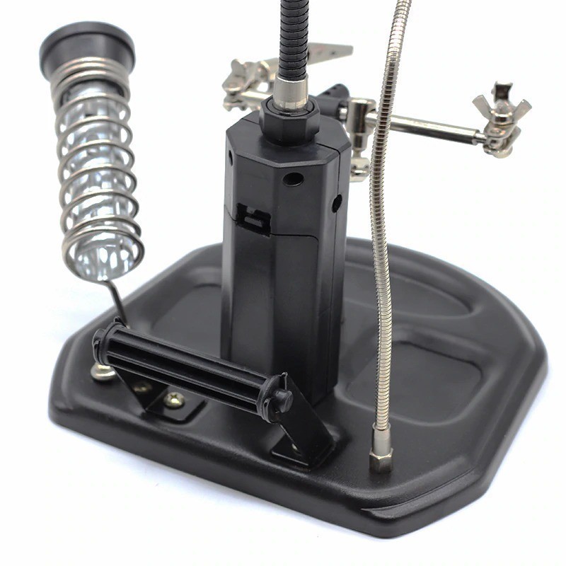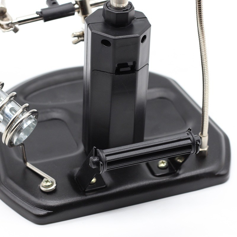 Освен това, третата ръка разполага с ярка LED подсветка с 5 светодиода, която осигурява оптимална видимост на работното поле. Можете да захранвате подсветката както с батерии, така и от 220V, за да имате възможност за работа без прекъсване.