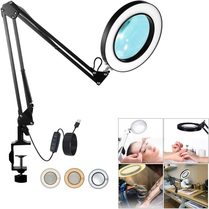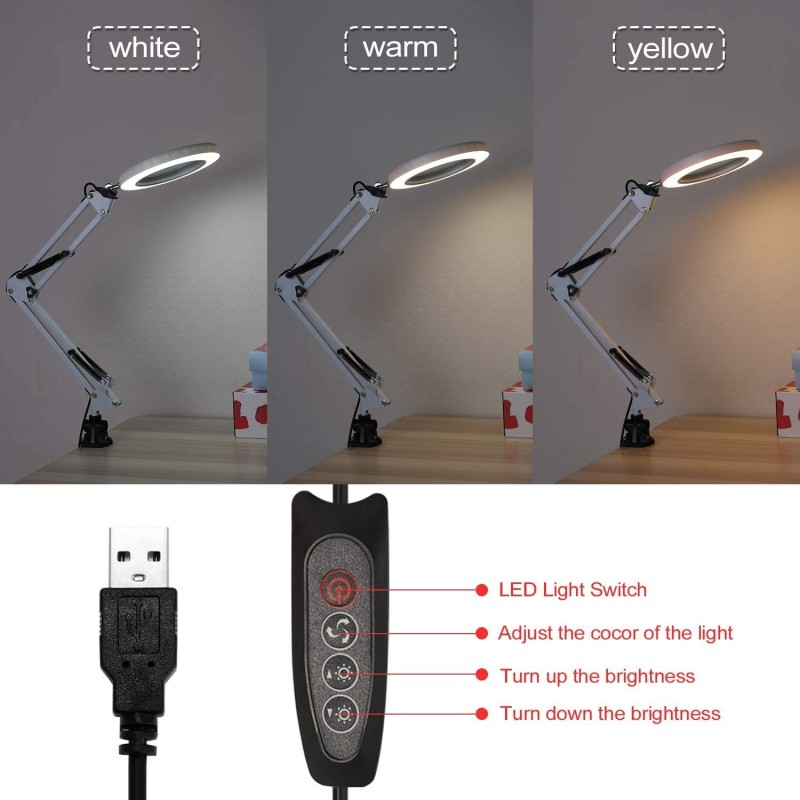 Основните предимства на тази настолна лампа са 5-кратното увеличение на лупата, което ви позволява да видите детайлите по-ясно и по-добре, както и възможността за фиксиране на лампата към маси или козметични колички. Захранването на лампата става посредством USB, като е необходим допълнителен USB адаптер за 220V с мощност до 2А. Лампата е налична в черен и бял цвят, което ви дава възможност да изберете този, който най-добре отговаря на вашите предпочитания и интериор.
