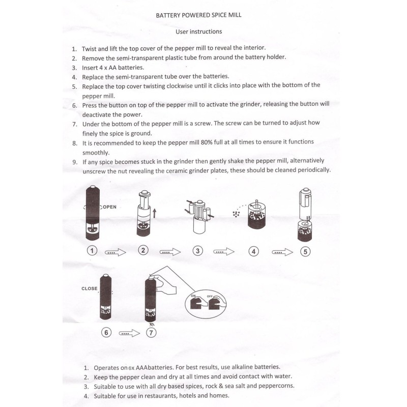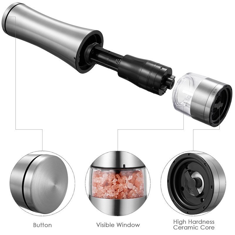Леката и практична конструкция на мелницата я прави изключително лесна за използване. Само с няколко натискания на бутона, можете бързо и удобно да смелете вашите подправки. А за да осигурите непрекъснато използване, мелницата работи с батерии тип ААА.