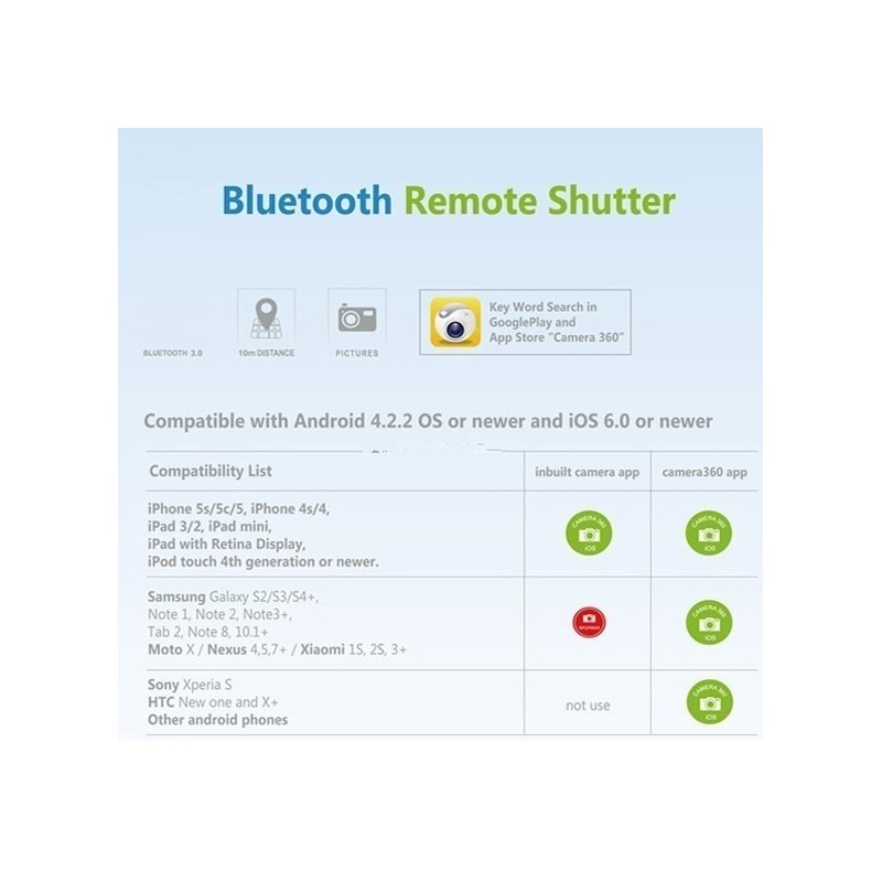Това дистанционно устройство ви позволява да правите снимки или да записвате видеоклипове с вашето устройство от разстояние до 10 метра. Просто го свържете чрез Bluetooth и се насладете на свободата да се фокусирате на снимката или видеото, без да се налага да държите устройството в ръка.