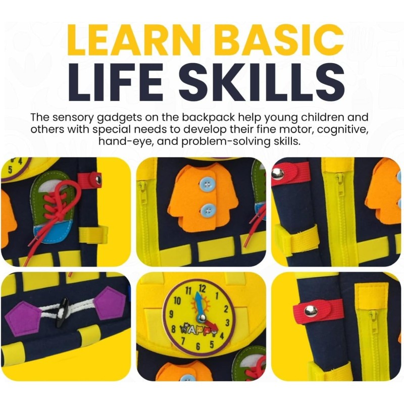 Сензорните играчки в раницата помагат на малки деца и хора със специални нужди да развият фина моторика и когнитивни умения, координация око-ръка и решаване на проблеми.