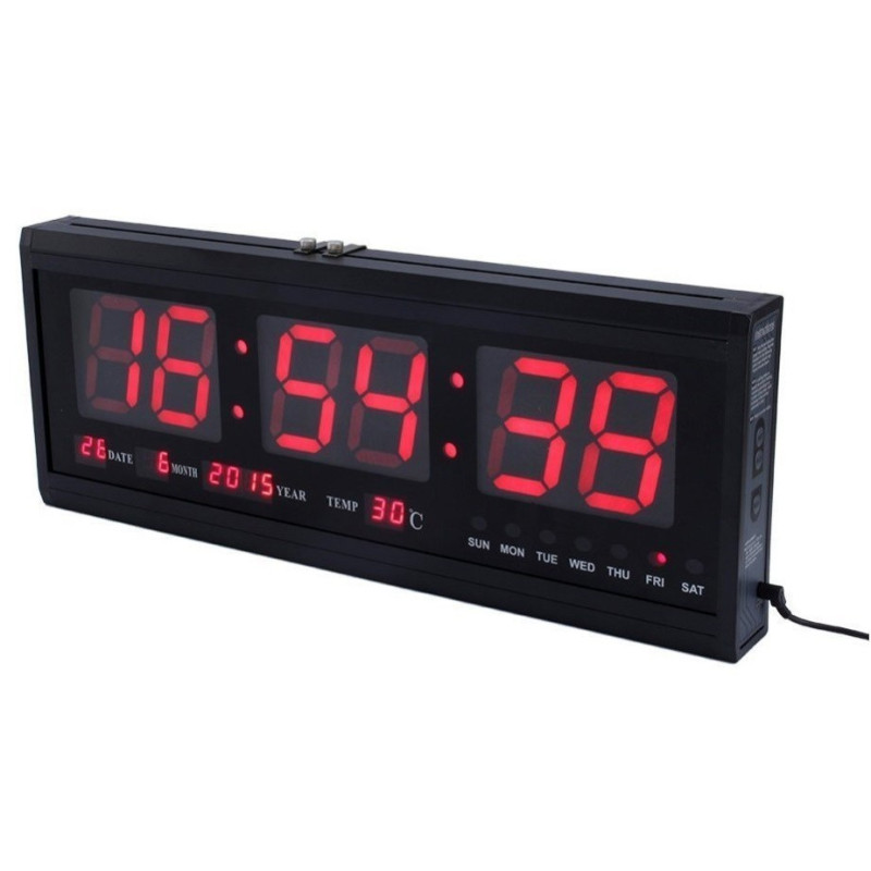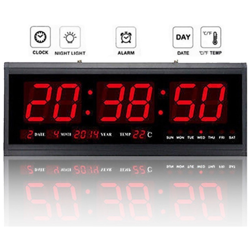 Голям електронен часовник за стена със светещи цифри, термометър и календар