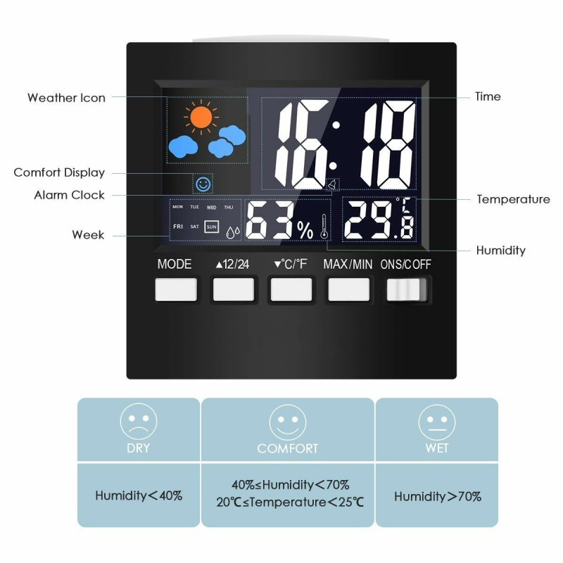 Настолен часовник с термометър, влагомер и календар за вътрешно ползване -50°C до 60°C | 10% до 99%