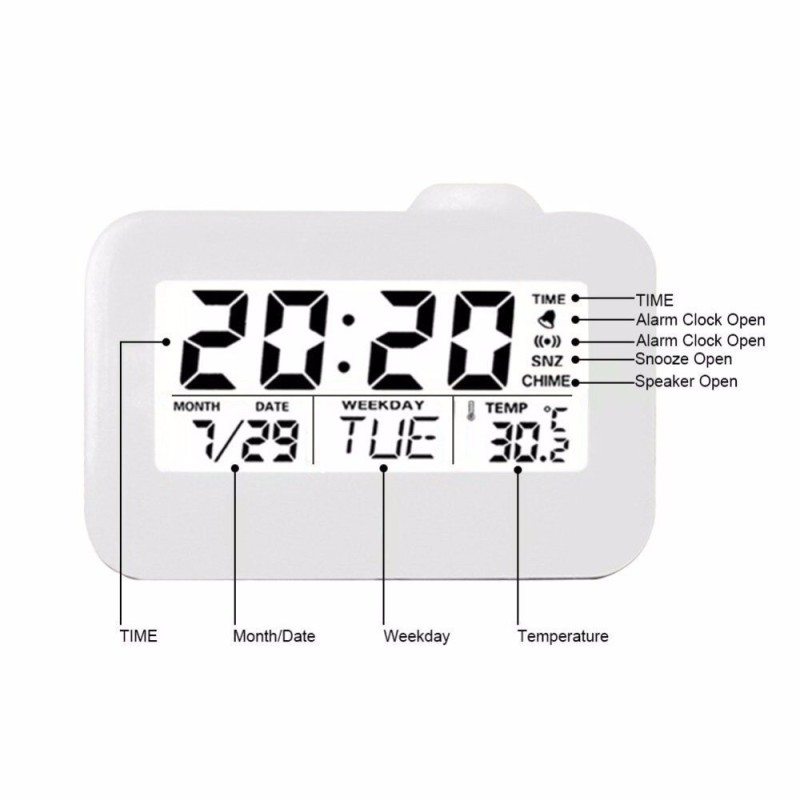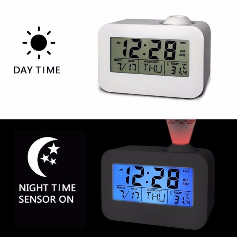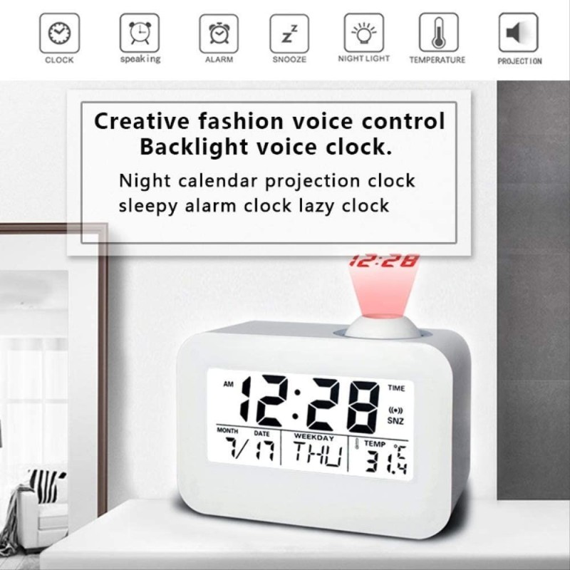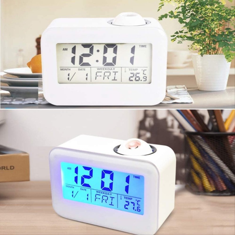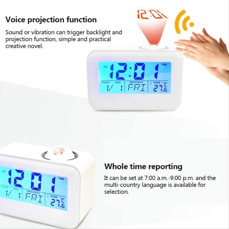LCD дисплеят на часовника със синя подсветка ви позволява лесно да разгледате часа, температурата, датата, месеца и деня от седмицата. Активирането на проекцията и LED подсветката става с плескане на ръцете или почукване по корпуса на часовника. Това е не само удобно, но и добавя интересен елемент към вашата стая.